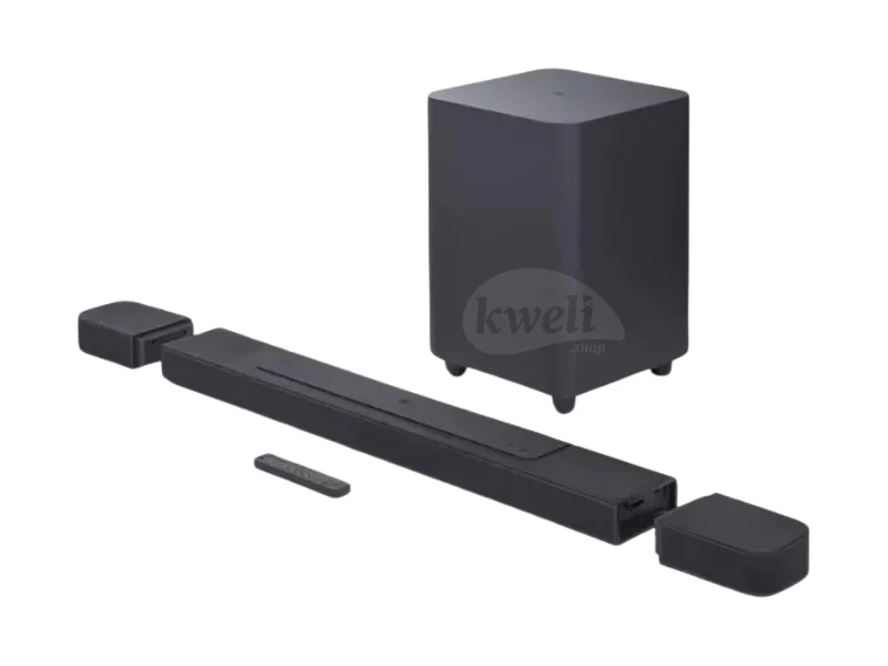 JBL Bar 1000; 7.1.4-Channel soundbar True Dolby Atmos, DTS:X, and MultiBeam Surround Sound: Immerse yourself in theatre-quality 3D sound. With two up-firing drivers in the main bar and two more in the detachable speakers, the JBL Bar 1000 delivers true Dolby Atmos and DTS:X together with MultiBeam for an enhanced 3D surround sound experience. Real surround sound with detachable surround speakers: Enjoy real surround sound without the hassle of extra wires and power connections. Just place the two detachable battery-powered surround speakers behind you and get swept away in amazing audio. Built-In Wi-Fi with AirPlay, Alexa Multi-Room Music and Chromecast built-in: Get ready to explore. Access over 300 online music streaming services through AirPlay, Alexa MRM and Chromecast built-in. Enjoy all of your favorite audio content, Internet radio, and podcasts in high definition. The Wi-Fi connection also allows automatic software updates, so you can always enjoy the latest features. 880W output power: With 880 watts of total system power the JBL Bar 1000 transforms your movies, music and games into immersive sound experiences and pulls you into the middle of the action. 10" Wireless subwoofer: Thrilling, precise bass from a mighty 10" wireless subwoofer brings excitement to your action movies and emotion to your music | #KweliGotYou| Order JBL Bar 1000; 7.1.4-Channel soundbar with Detachable Surround Speakers, MultiBeam™, Dolby Atmos®, and DTS:X®, Black online and enjoy free delivery across Uganda > Long warranty > Lifetime After-sales Support