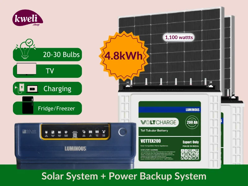 Kweli Solar System & Power Backup System The Kweli 1.1kW-5kWh-1.5kVA Hybrid Solar System & Power Backup Solution – Tubular incorporates a 5kWh tubular battery, providing a comprehensive solar energy solution. With a 1.1kW solar panel array and efficient battery storage, it ensures consistent power for essentials like 25 bulbs, fridges, TVs, home theatre, fans, laptops, phone charging, and internet routers. Designed for reliability, it’s ideal for residential and commercial settings, offering sustainable and cost-effective electricity. Included in this package 1,100w 24V Monocrystalline Solar Panels 4.8kWh Luminous Tubular battery 1.5kVA 24V Hybrid Inverter with Built-in Charge Controller NOT included in this package (may attract additional costs if needed) Panel stands DC Cable House wiring (labour) Materials for house wiring Bulb holders Bulbs Switches Sockets Distribution board Note: The user is encouraged to take precautions not to overload the system or over-drain the battery to attain a longer system life