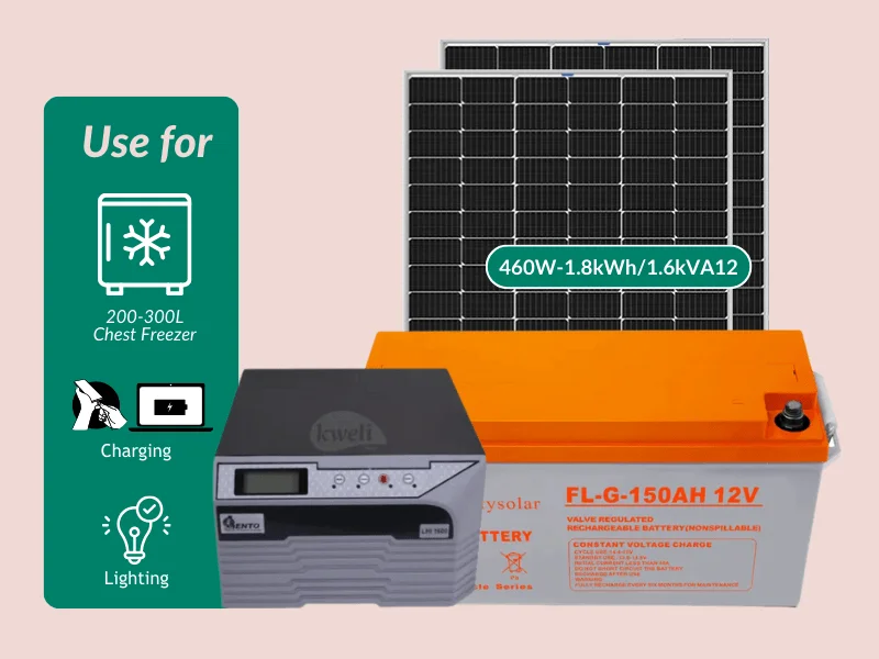 Buy new Kweli Energy 460W-1.8kWh-1.6kVA Hybrid Solar System & Power Backup Solution; Power your Freezer, Laptop Charging, Phone Charging and Lighting in Uganda - - Free Delivery > Long warranty > Life
