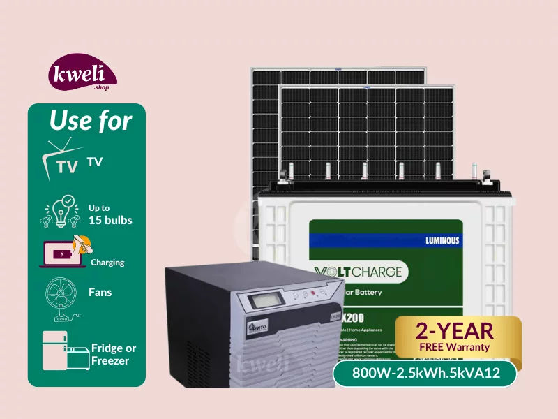 Buy new Kweli Energy 800W-2.5kWh-1.6kVA12V Hybrid Solar System & Power Backup System; Run upto 15 Bulbs, Fridge, TV, Laptop and Phone Charging for 8-12 hours in Uganda - - Free Delivery > Long warrant
