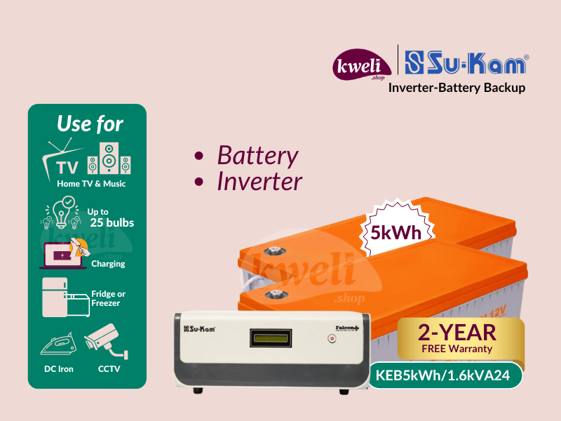 Kweli-Su-Kam 5kWh1600VA24-GEL Power Backup System: Keep your home bright and connected effortlessly! Power up to 25 bulbs, TV, fan, DC iron, fridge, phone, and laptop for up to 24 hours during power outages. This efficient system charges via the grid (Umeme) and ensures your essential appliances run smoothly. Reliable, efficient, and perfect for your home needs. The system features; A 5kWh Gel Battery bank 1600VA 24V Pure Sine Wave Inverter. Charge with Umeme/grid Low battery protection Overload protection The built-in changeover automatically switches to the backup when the power goes off 2-year system warranty This power backup system can power the following; TV Fridge up to 25 lights Phone charging Laptop charging Music DC Flat iron Fan CCTV This package/offer includes: Battery Inverter Cable | #KweliGotYou| Order Kweli-Su-Kam 5kWh1600VA24-GEL Power Backup System; Run up to 25 Bulbs, TV, Fan, DC Iron, Fridge, Charging for up to 24 Hours online and enjoy free delivery across Uganda > Long warranty > Lifetime After-sales Support