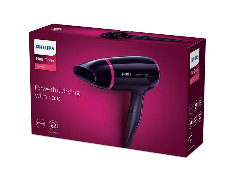 Description Powerful drying with care The Philips Hair Dryer Essential provides you with powerful drying of 1600 watt, while caring for your hair with the ThermoProtect temperature setting. Easy to use with 3 heat & speed settings and cool shot.