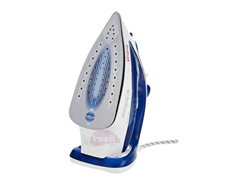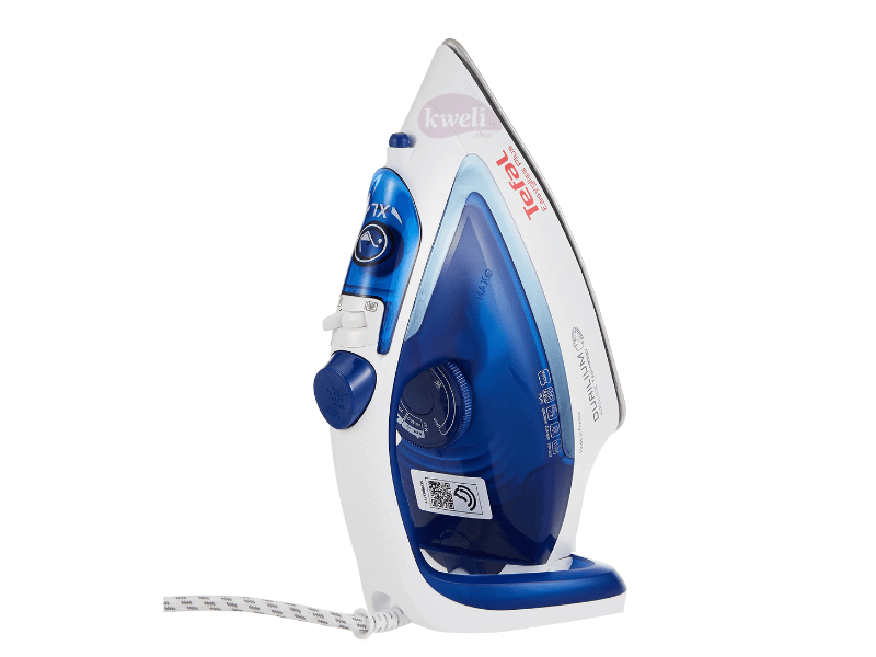 Tefal Easy Steam Steam Iron FV5715M0 Steam Iron 2400W of power ensures a quick start-up time 45 g per minute continuous steam output Soleplate Technology Extra-powerful 190 g per minute steam boost to tackle stubborn creases. Durilium Airglid Soleplate Water tank Capacity, 270ml Colour: White & Blue 1 year FREE warranty | #KweliGotYou| Order Tefal Steam Iron 270 ml FV5715M0; 2400W online and enjoy free delivery across Uganda > Long warranty > Lifetime After-sales Support