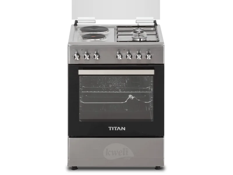 Titan 2 Gas + 2 Electric Cooker TN-FC6220XBS 60cm wide cooker. H: 85cm, D: 60cm. 2 Gas burners with automatic electric ignition 2 Electric Hot plates Electric Oven Electric Grill & Rotiserrie Oven Timer Enamel Pan Support 1-year warranty | #KweliGotYou| Order Titan 2 Gas + 2 Electric Cooker TN-FC6220XBS; 60cm Cooker, Electric Oven & Grill, Rotisserie online and enjoy free delivery across Uganda > Long warranty > Lifetime After-sales Support