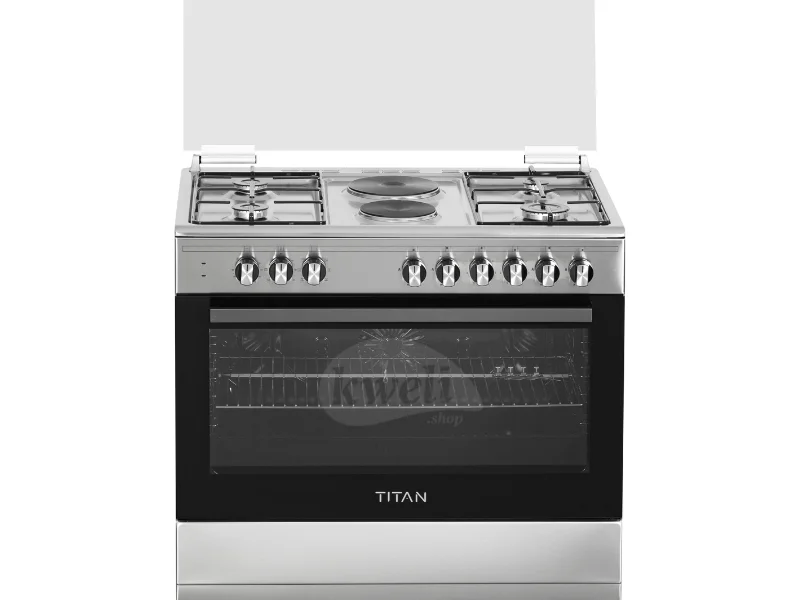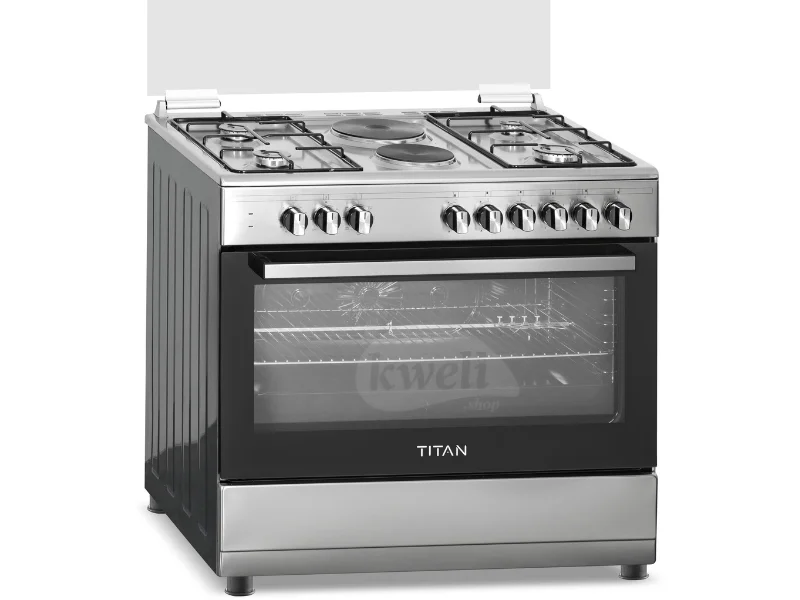 Titan 4 Gas + 2 Electric Cooker TN-FC9420XBS 90cm wide cooker. H: 85cm, D: 60cm. 4 Gas burners with automatic electric ignition 2 Electric Hot plates Electric Oven Electric Grill & Rotiserrie Oven Fan Oven Lamp Timer Enamelled Pan Support 1-year warranty | #KweliGotYou| Order Titan 4 Gas + 2 Electric Cooker TN-FC9420XBS; 90cm Cooker, Electric Oven & Grill, Oven Fan online and enjoy free delivery across Uganda > Long warranty > Lifetime After-sales Support