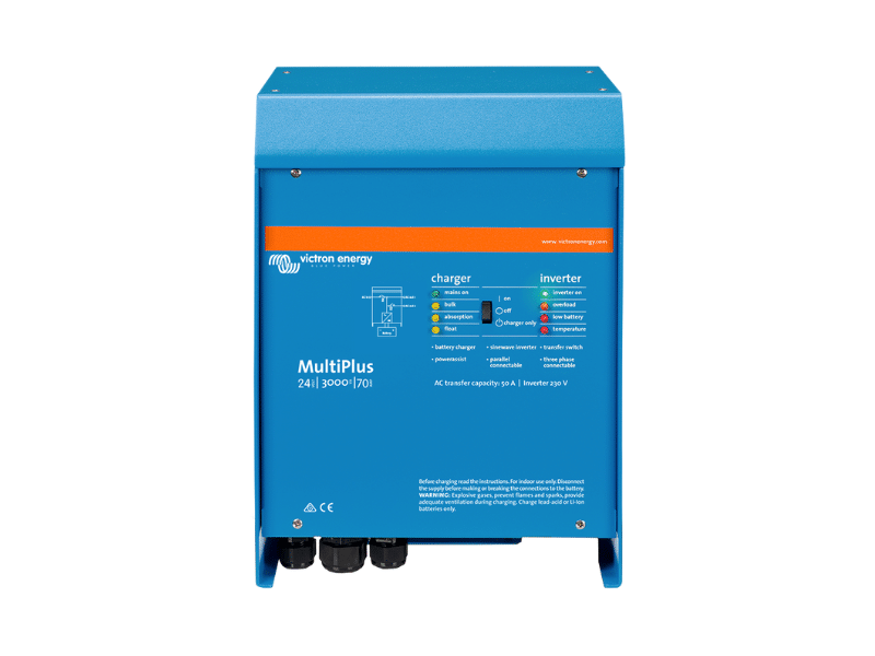 Victron MultiPlus 3kVA/2.4kW 24V Inverter Charger 24/3000/70-50 230 Inverter Power Output (VA): 3,000 VA Continuous Output Power (W): 2,400 W (at 25°C) Peak Power: 6,000 W Input Voltage Range (DC): 19 – 33 V Nominal Battery Voltage: 24V Output Voltage (AC): 230 V ± 2% Output Frequency: 50 Hz or 60 Hz ± 0.1% Battery Charger Charge Voltage (Absorption): 28.8 V Charge Voltage (Float): 27.6 V Storage Mode Voltage: 26.4 V Charge Current: 70 A Starter Battery Charge Current: 4 A Temperature Sensor: Included Compatible Battery Types Lead-Acid Batteries: AGM, Gel, and Flooded types. Lithium-Ion Batteries: Compatible with lithium systems, supporting external Battery Management Systems (BMS). Transfer Switch AC Transfer Capacity: 50 A Efficiency Maximum Efficiency: 94% Zero Load Power Consumption: In AES Mode: 15 W In Search Mode: 8 W Environmental Specifications Operating Temperature Range: -40°C to +65°C (fan-assisted cooling) Humidity (Non-condensing): Max. 95% Physical Specifications Dimensions (HxWxD): 362 x 258 x 218 mm Weight: 19 kg Enclosure Material & Colour: Aluminium, Blue (RAL 5012) Protection Category: IP21