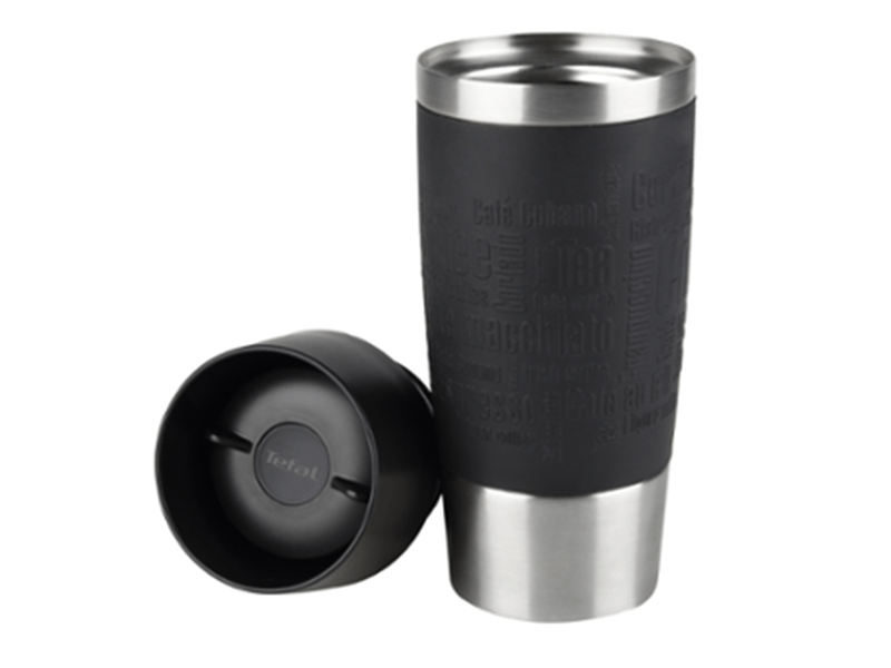 Description TEFAL TRAVEL MUG GRANDE 0.5 L BLACK Have all your favorite drinks ‘to go‘! Take your favorite hot and cold drinks with you in the stylish Tefal travel mug. The 360 drinking edge lets you drink from anywhere around the rim. There’s no designated drinking hole, so no need to look down at the cup when you’re on the move. Our tried-and-trusted Quick-Press closure allows for one-handed operation: just press the button on top to open and close. When closed, the Tefal travel mug is 100% leakproof, so you can carry it in your bag without worrying about spills. It has a 0.5L capacity, so you can even fill it with your shop-bought latte, while the slim body fits most car cup-holders. The attractive embossed, soft-touch silicone sleeve ensures a secure grip on the go, while the non-slip base stops the mug sliding around if your journey gets bumpy. Thanks to the vacuum-insulated, double-walled stainless-steel liner, drinks stay hot for up to 6 hours and cold for up to 12 hours. So, it’ll keep your coffee hot all morning and your water chilled on the way home! Plus, it’s a breeze to clean: the lid separates into two for a thorough cleanse and all parts are dishwasher safe. For peace of mind, the Tefal travel mug is made from BPA-free materials and has a five-year guarantee. Easy drinking: The 360° drinking edge lets you drink from any direction, while the Quick-Press closure allows simple, one-handed operation – just press the button on top and drink away! Safe and secure: 100% leakproof, 0.5L travel mug in a slim design to fit most car cup-holders, with a soft-touch silicone sleeve for a secure grip and non-slip base to stop it sliding about on the go. Perfect temperature: The vacuum-insulated, double-walled stainless-steel liner keeps drinks piping hot for up to 6 hours and ice cold for up to 12 hours. Fuss-free maintenance: It has a convenient two-part lid for thorough cleaning and all parts are dishwasher friendly. Just pop it in with your other dishes and it’ll be ready to go again. Peace of mind: Made using certified BPA-free and non-toxic materials, the Tefal travel mug is completely harmless. It’s also guaranteed for five years, so you know it will stand the test of time.