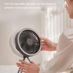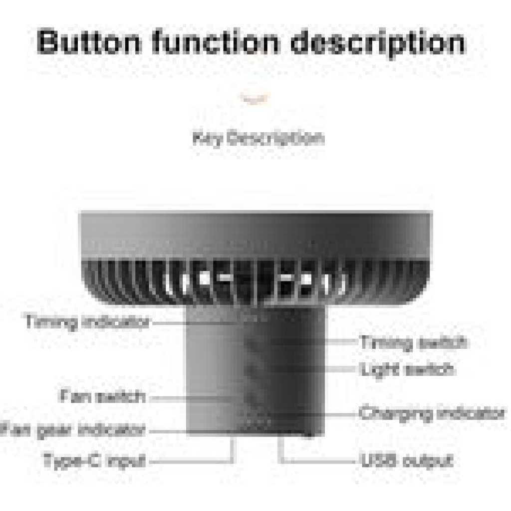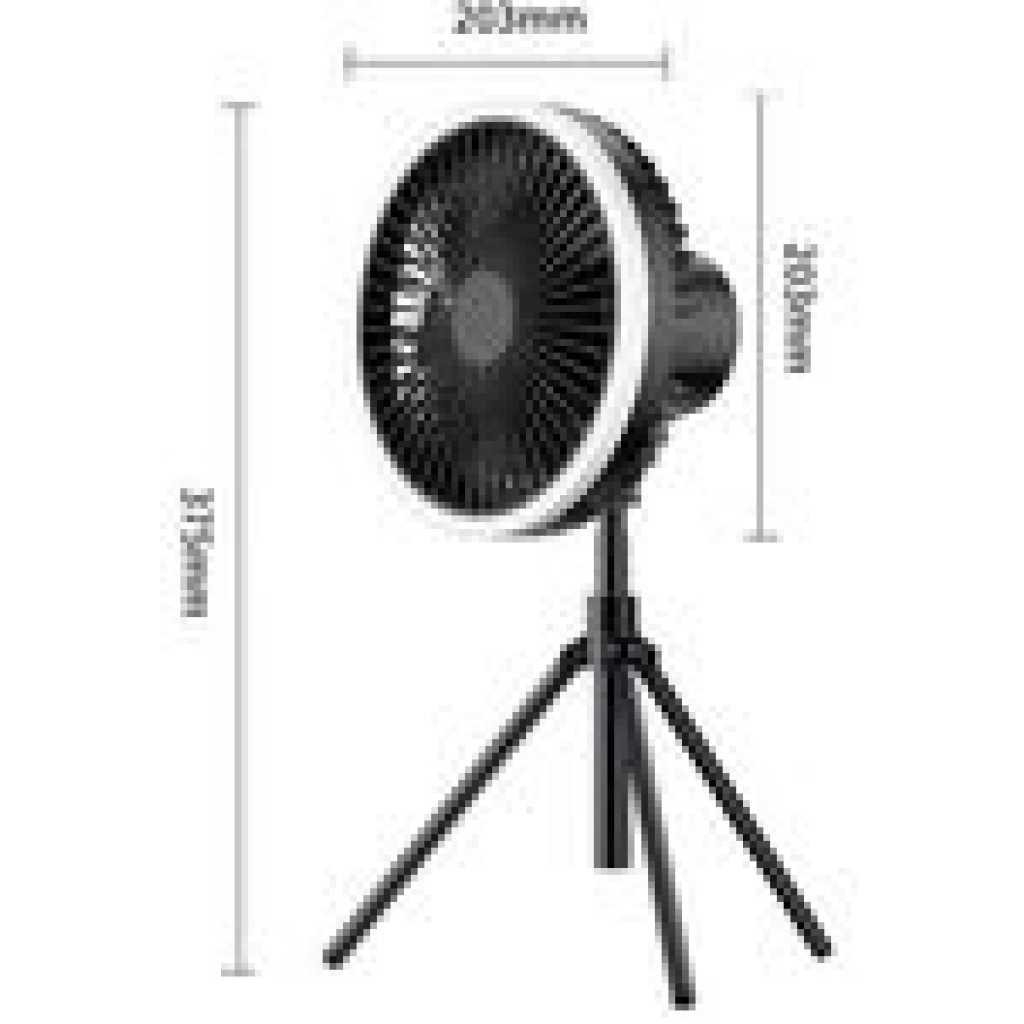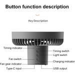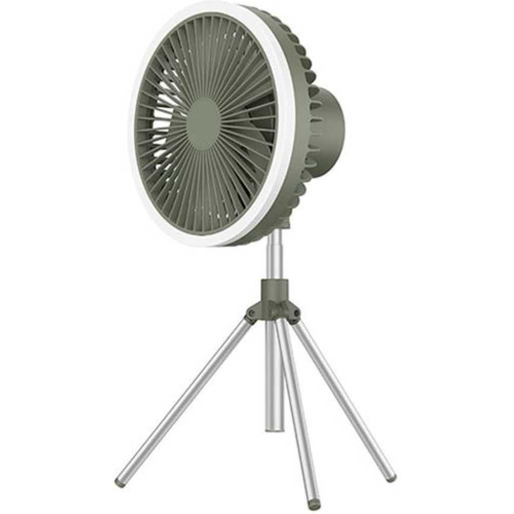 Product Name: Tripod Fan Colour: Khaki, Green, Black Product size: 180*180*115mm (main fan) 192*183*342mm (tripod fan) Product weight (bare): 560g Rated input: DC5.0V/2.0A Operating current: 0.3-1A Rated power: ≤4W Battery capacity: 10000 mA Battery life: approx. 27 hours for 1-speed wind, approx. 13 hours for 2-speed wind, approx. 8 hours for 3-speed fan Charging time: approx. 4.5 hours Mainframe: ABS/PP/Silicone/Electronic components Tripod: silicone/aluminium Product comes with accessories details: Fan main unit*1, tripod*1, hook*1, Type-c charging cable*1, English and Chinese manual*1 Operating instructions: Fan function: Press the switch once to start 1 speed, press the switch a second time to start 2 speeds, press the switch a third time to start 3 speeds, press the switch a fourth time to turn off the fan. The above cycle. Light function: Press the switch once to activate 1 light level, press the switch a second time to activate 2 light levels, press the switch a third time to activate 3 light levels, press the switch a fourth time to switch off the light. The above cycle. Timer function: press the switch once to activate the 1h timer, press the switch a second time to activate the 3h timer, press the switch a third time to activate the 5h timer, press the switch a fourth time to switch off the timer. The above cycle. Indicator light description: blue light when the output USB is working, red light for charging status, green light for full charge. Product selling point: Dual use for hanging and standing Four wind speeds Seven-colour ambient light Remote control with automatic head shaking USB emergency charging port Removable washable grille Retractable stand lift