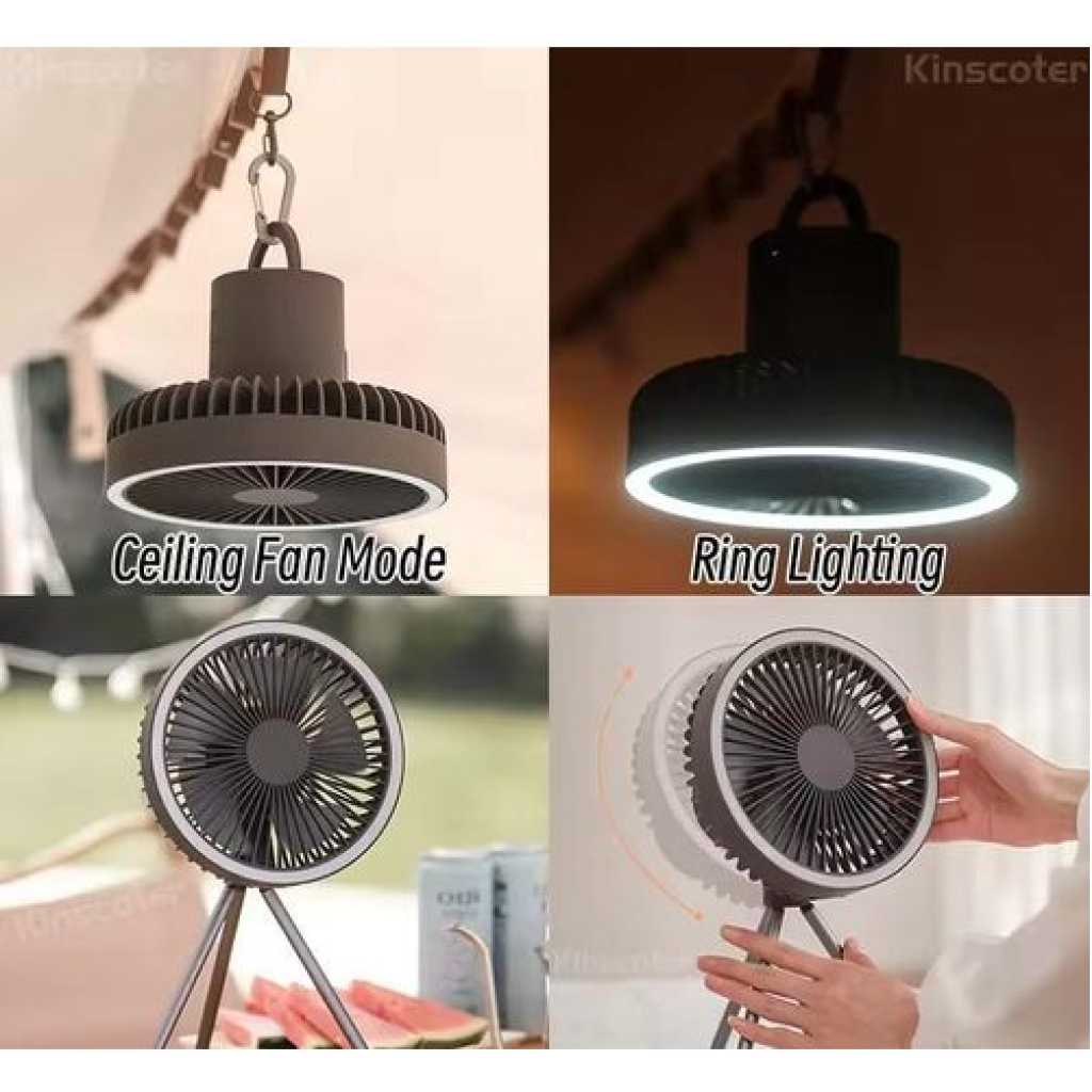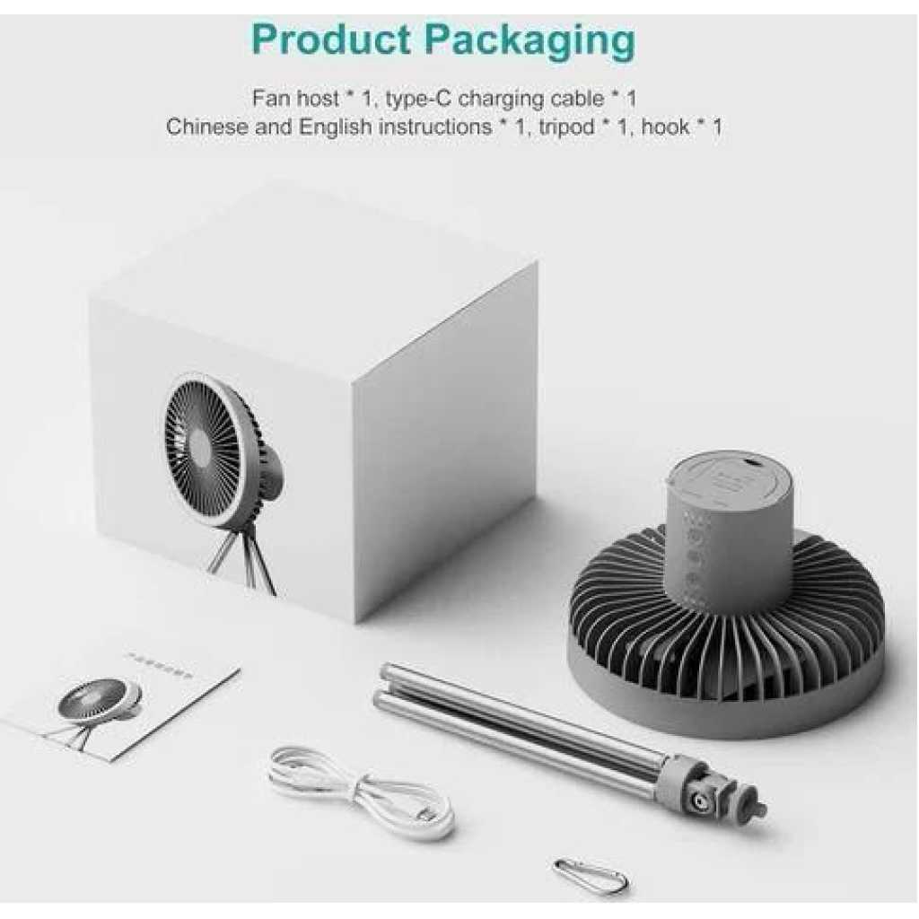 Key Features: 1,Aluminium alloy tripod detachable design, highlighting the high-end quality . 2,One machine is multi-purpose, can be used as desktop fan, ceiling fan, chandelier. 3,Timing function, 3 levels adjustable 1h, 3h, 5h. 4,2A input/output, can do the function of rechargeable battery. 5, 10000 mA polymer lithium battery, long battery life, safe and more secure.