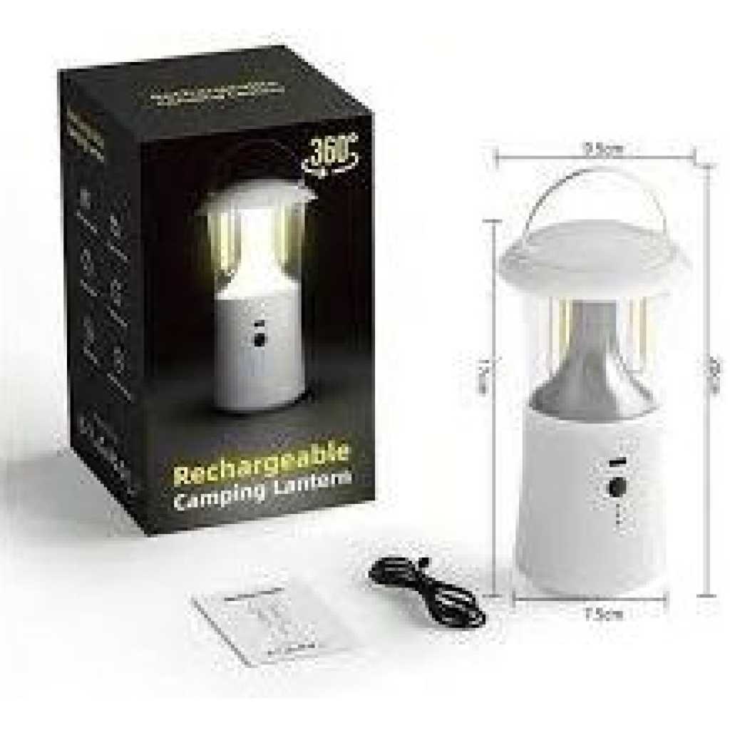 Key Features: 【Durable and Portable】This camping lantern is made of high quality ABS and stainless steel, which is very durable. Portable hook design and high quality metal handle make it easy to carry and hang. This small camping light measures only 6.3 x 4 x 2.7 inches and weighs 0.66 pounds. 【Dimmable & 3 Lighting Modes】 The camping lanterns have three modes: white light (6000K), warm light (2500K) and warm white light (4000K), each with 4 adjustable brightness levels (100% → 70% → 30% → 5%). You can adjust the brightness of our camping lights by long pressing the switch button. Or short press the switch button to change the color temperature. 【Long Battery Life & Emergency Use】 The camping lamp has a built-in 1200mAh large capacity rechargeable battery and Type-C interface, and it only takes about 3 hours to fully charge. The battery lasts up to 3 days in low light mode and 2 hours in maximum brightness mode. 【IPX4 Water Resistant】IPX4 protection levels (Type-C interface avoids contact with water). Our camp tent lights are also used as indoor decorative lights, night lights, as a useful aid while working, studying or reading a book just before bedtime! Perfect gift for the people you love. 【Portable and Versatile】Portable and durable, very convenient and space-saving, can be easily stored in your backpack and start your journey at any time. It is a great choice for camping, fishing, outdoor activities, hiking, reading, indoor use, etc. 【Super Bright 360°】 The camping lantern is equipped with an energy-efficient LED bulb, 360° irradiation without dead angle. When camping, in the event of a power outage or emergency, the camping light provides enough brightness for use. Warm light and warm white light can easily create a sense of warm atmosphere, allowing you to relax well. It can also be used as a bedside lamp for the bedroom.