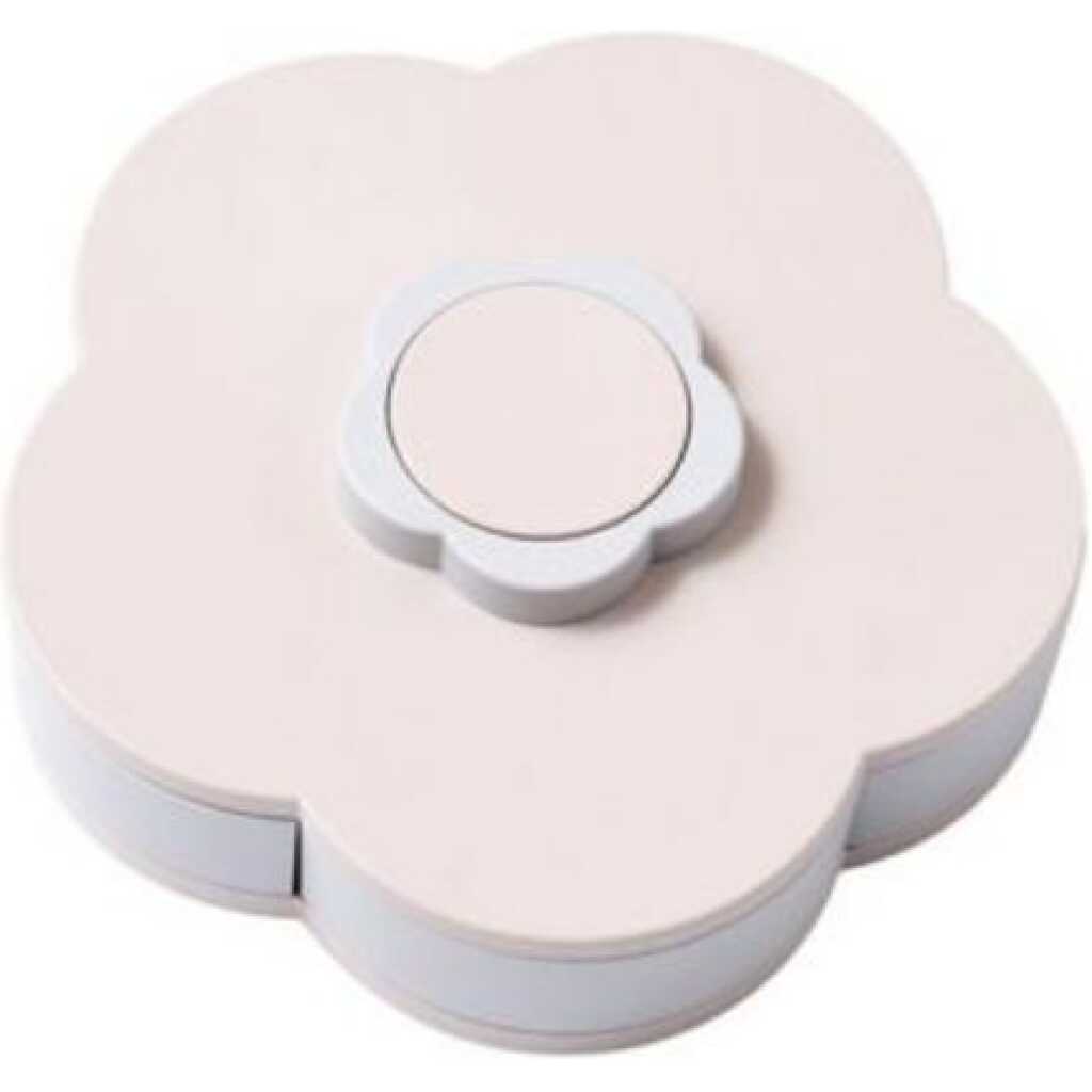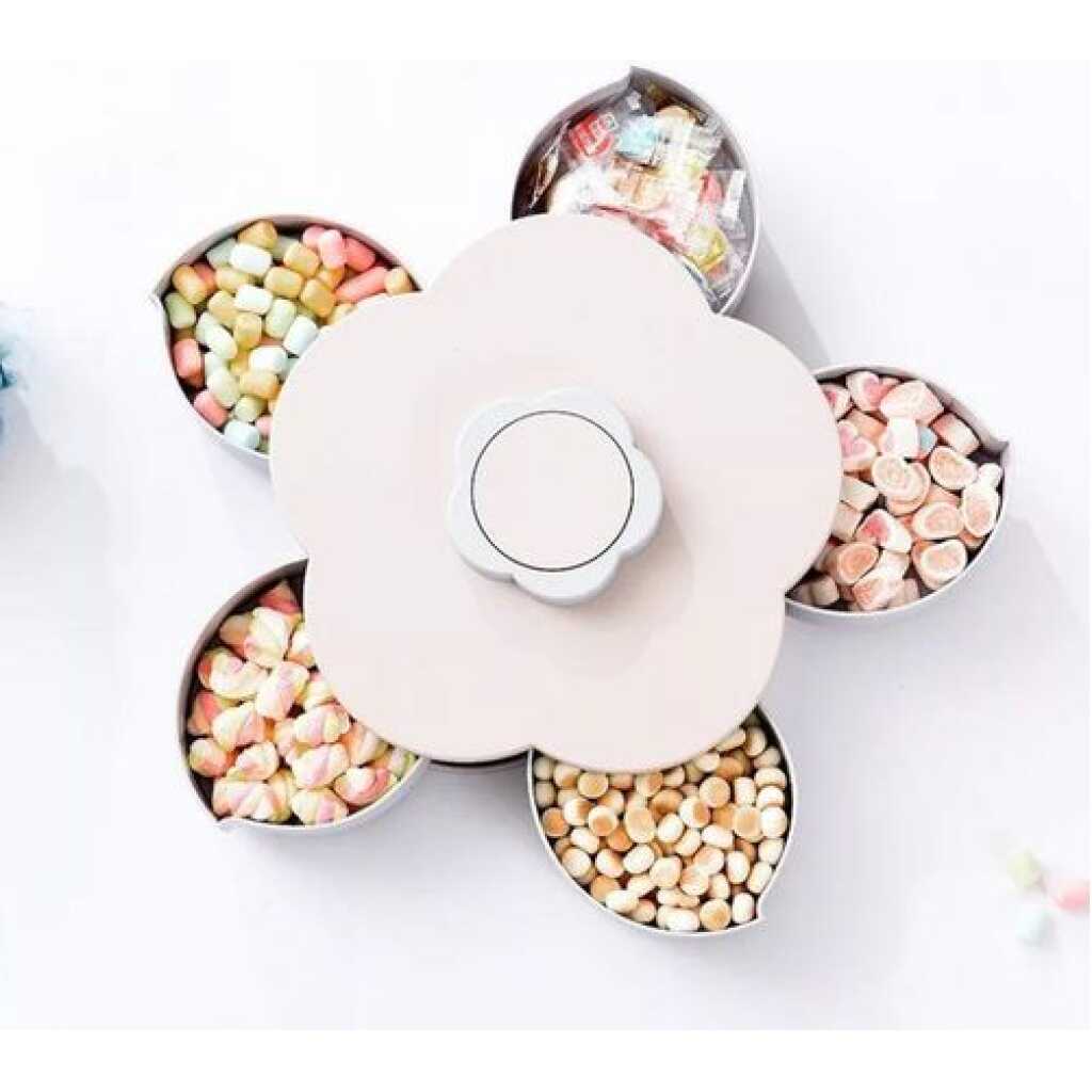 Candy Box Serving Rotating Tray Storage With Mobile Phone Stand – Pink. Convenient To use Specifications: Material: ABS Product specifications: 27 x 9.5 CM. Petal-shaped Nut Sundry Snacks Plastic Storage Box. Very creative, this is definitely your favorite when you are meeting with your friends and watching TV. The candy box is designed to be five-grid, can store 5 kinds of snacks, rich in variety, and food storage is not mixed. Creative design, rotation open fun small life, easy to twist can open the box, a variety of food presentation, very convenient. The smart candy box is made with healthy ABS material. non-toxic and environmental protection Five kinds of candies, nuts, or other snacks Can also be a decoration in your living room. Best mechanism of rotating to open or close.
