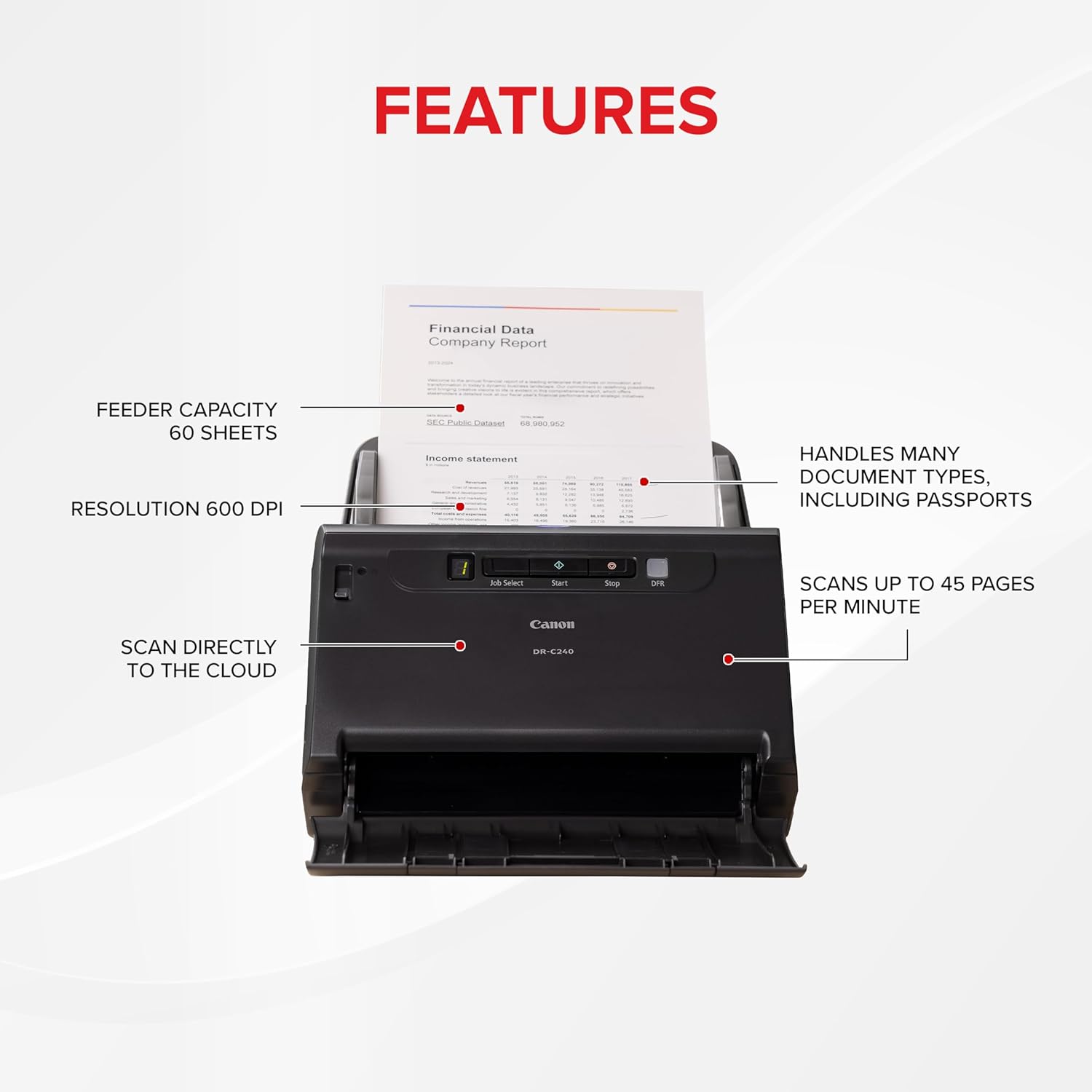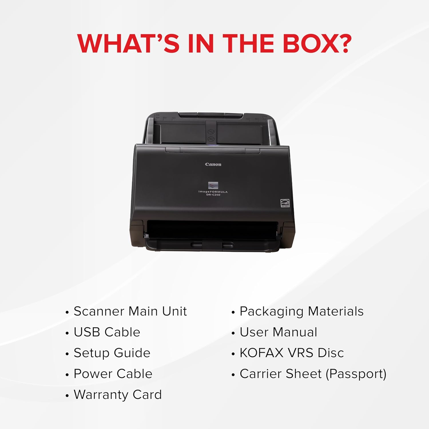 Canon imageFORMULA DR-C240 Document Scanner, CMOS CIS 1 Line Sensor, Up to 600 DPI Optical Resolution, Black & White Scanning Mode, Up to 90 ipm Scanning Speed