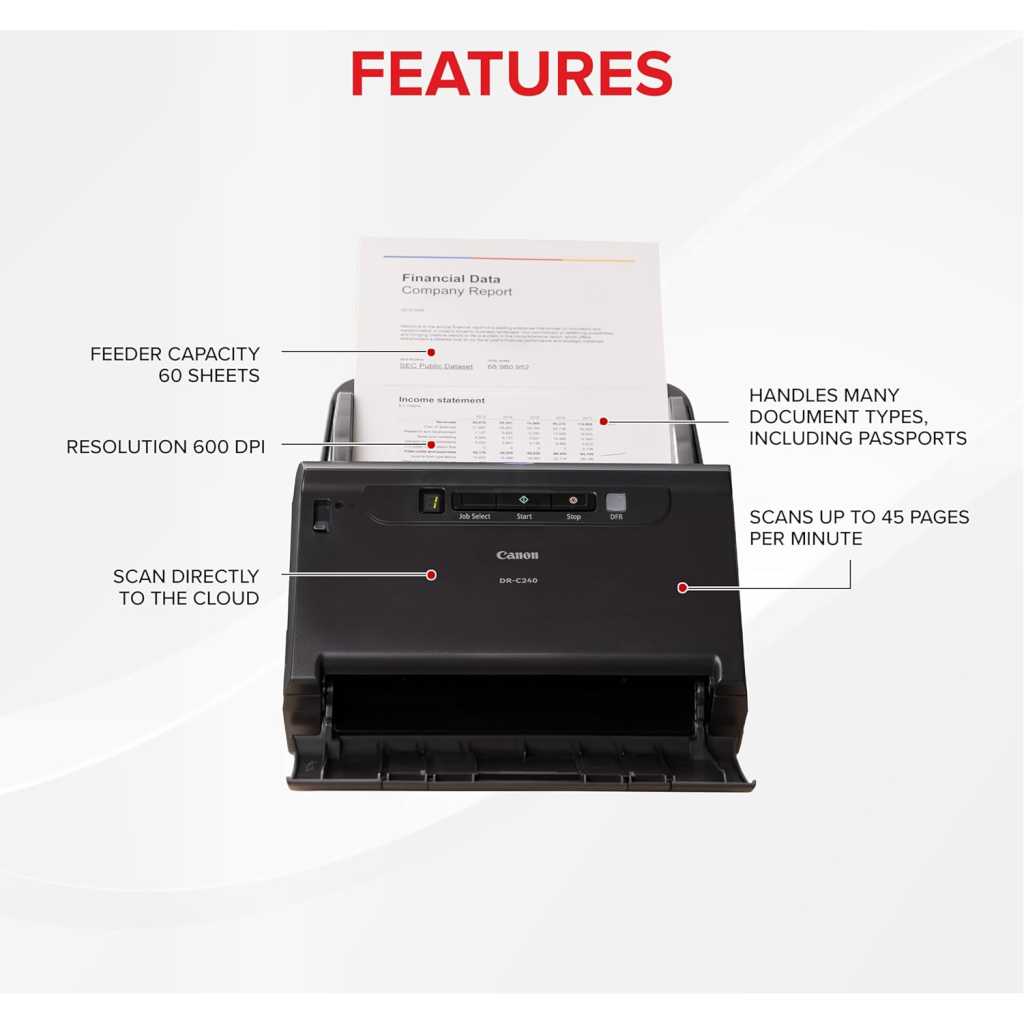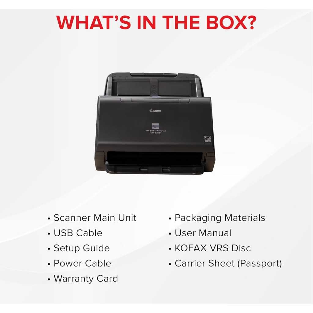 imageFORMULA DR-C240 Benefits Boost productivity with fast 2-sided scanning at up to 90ipm Easily scan various types of documents including passports with one compact device Enjoy peace of mind with supreme paper-handling reliability and durable construction Enhance your environment with quiet operation, compact build and elegant design