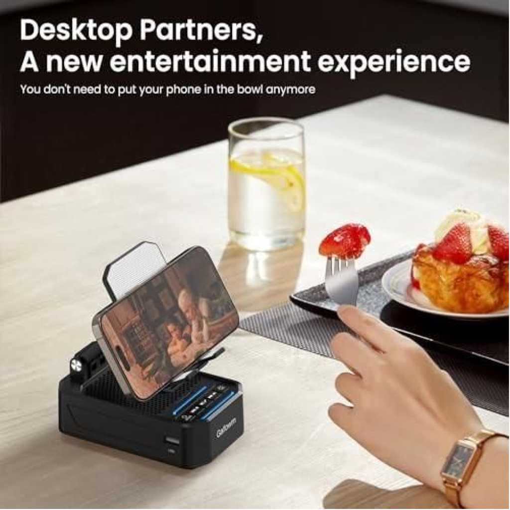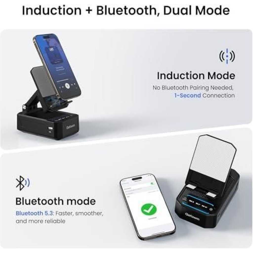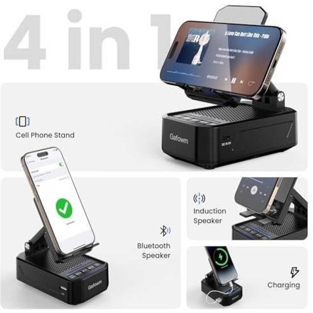 The product pictured is the Gafowm F31 cell phone stand with instant wireless induction speaker . This versatile 5-in-1 device combines multiple features for convenience at your desk, in your bedroom, or for travel. Key Features Dual Speaker Modes: The device offers two ways to play audio. Instant Induction Play: Simply place your phone vertically on the stand, and audio begins playing automatically without the need for Bluetooth pairing. This is ideal for quick use or for individuals who are hearing impaired. Bluetooth Speaker: For a more stable, premium listening experience, you can connect via Bluetooth. Phone Stand: The stand is adjustable, often featuring 360° rotation and a foldable design, allowing for various viewing angles for watching videos or making video calls hands-free. Power Bank: It includes a built-in 2000mAh (or sometimes higher capacity in similar models) emergency power supply with a USB port to charge your phone in a pinch. LED Lights/Alarm Clock: Some variations of this model also incorporate colorful LED ambient lights or an alarm clock featur