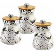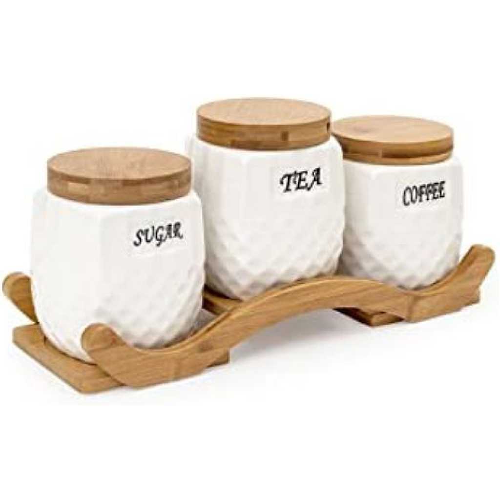 Key Features: Ceramic Trime Tea Coffee Sugar 3 Canisters Set With Wooden Wavey Stand Tray & Bamboo Lid Condiment Airtight Jars Set- White. Tea Coffee Sugar sets ceramic jars Bamboo wooden airtight lids The bamboo base for easy storage Eco-friendly bamboo wooden bridge design Durable modern raised novelty design Hand wash recommended.