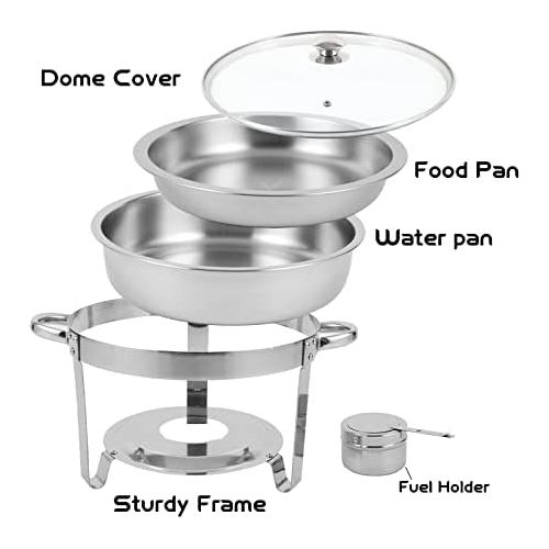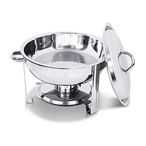 Chafing Dish Round Chafer Buffet Catering Warmer Food And Water Pan, Lid, Solid Stand, And Fuel Holder. Features stainless steel, with a mirror-polish finish for a unique look, this SUPER DEAL chafer is designed for everyday use at your finest catered events. Use it to create a beautiful buffet setting without breaking the bank. Plus, whether you’re serving up a delectable egg bake or your signature side dish, this chafer will present it in style. Durable Construction A durable stainless steel construction ensures this chafer is built to withstand everyday use, while providing a timeless appearance that blends in with your classic decor. Mirror Finish Each chafer features a highly-polished mirror finish that will shimmer in the ambient lighting of your venue. With its high quality finish, this chafer will add to the presentation value of any of the sides or entrees that you are serving! Sturdy Handles A sturdy handle on the cover makes for efficient service, while two handles on the chafer stand ensure easy transport. Broad Legs For optimum stability, a total of three broad, evenly-spaced legs keep the chafer sturdy on your buffet line. Elevated Fuel Stand The fuel stand is positioned close to the water pan. This helps maintain your food’s serving temperature for hours. Specifications: Overall Size: About 16.5” x 13.5” x 11.4”(L X W X H) Alcohol Furnace Size: 3.5″ D X2.4″ H Material: Stainless Steel Volume: 5 Quart