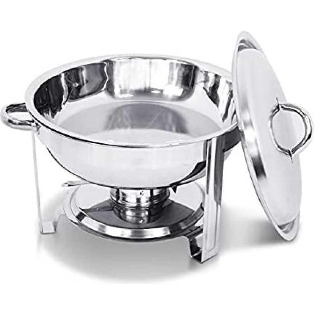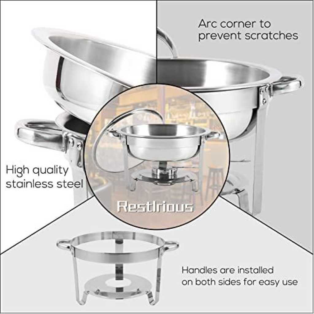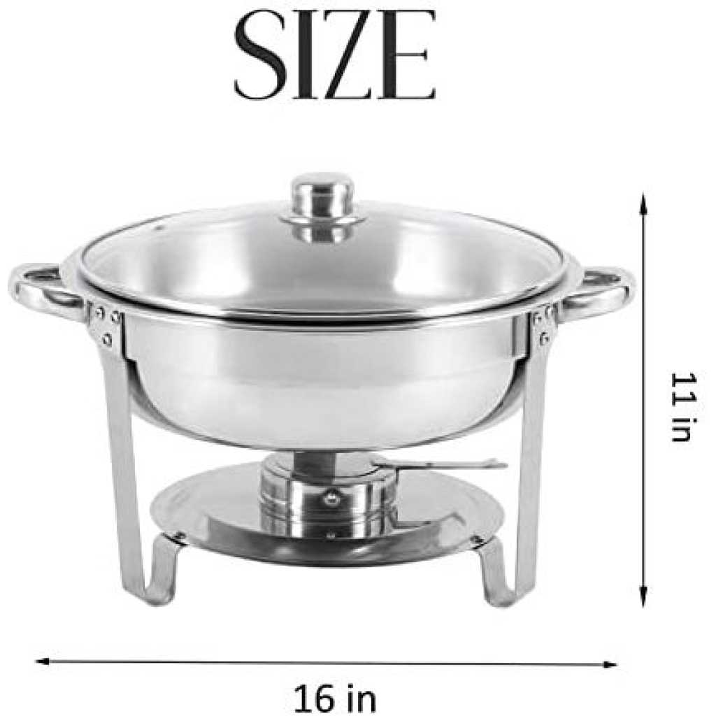Key Features: Chafing Dish Round Chafer Buffet Catering Warmer Food And Water Pan, Lid, Solid Stand, And Fuel Holder. Durable Construction – Made completely out of corrosion-resistant 18/8 stainless steel, the stainless steel is a heavy commercial grade, yet it is still lightweight to lift, this chafer is built to withstand the demands of your catering outfit or buffet line. With durable stainless steel construction, its elegant and spacious design adds long-lasting serving functionality and sleek style to any party or catering event. Even Heat Distribution – Maintains proper food temperature for the best cuisine with this heavy-duty 5-quart buffet chafer. Place your heat source in the fuel holder, install and fill the lower pan with water to evenly distribute heat, and place your food in the upper pan. This durable stainless steel chafing dish maintains foods at just the right temperature and can keep food hot or cold for hours. Considerable Details – Features a heavy-duty stand to provide stability. The elevated shelf positions heat close to the water pan, maintaining your food’s perfect serving temperature for hours. This elevation also minimizes exposure to the flame, ensuring guest’s and staff’s safety. One of the biggest advantages of this chafer is that you can serve directly from the oven or stovetop using the wide stainless steel handles for easily transporting the dish. One Complete Kit – Complete with a water pan, food pan, cover, and fuel holders, this chafer has everything you need to keep your hot food items warm throughout the entire length of your reception, banquet, or catered event. This chafer features a divided food pan for ultimate versatility and allows you to be served right away! The Perfect Addition – Get out of the kitchen and into the cooking spotlight. Stainless steel ensures superior strength. NEVER rust, tarnish or corrode. To draw your guests in, a mirror finish on the lid and body of this chafer beautifully picks up on and reflects out, your venue’s ambient lighting for a glamorous presentation.