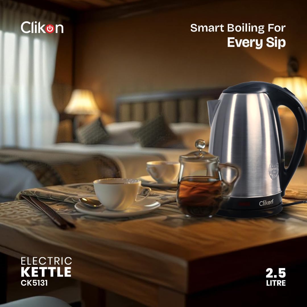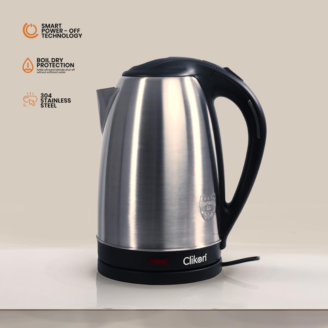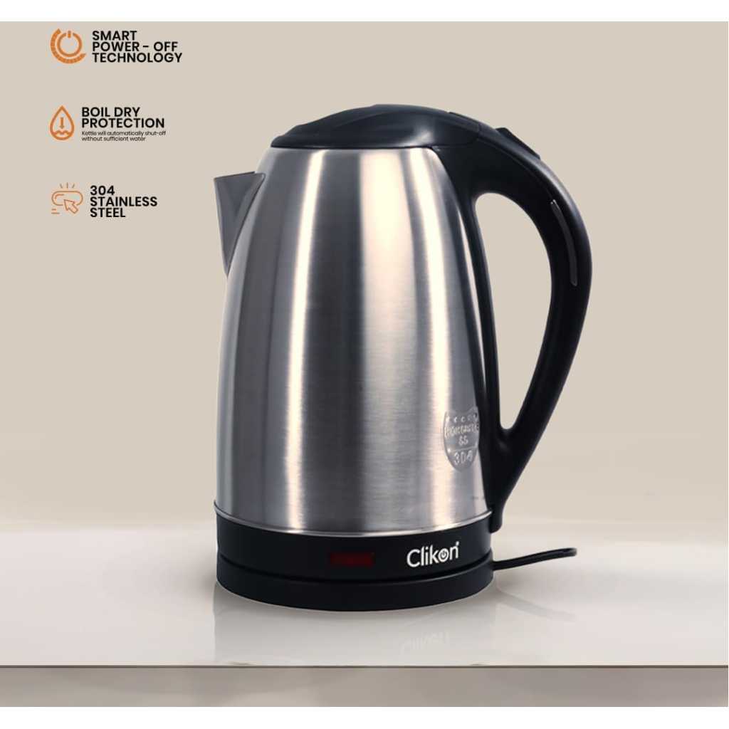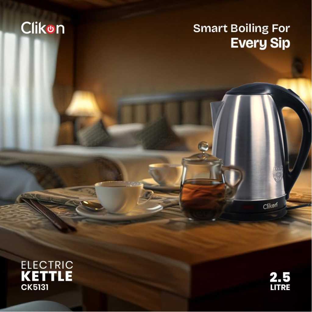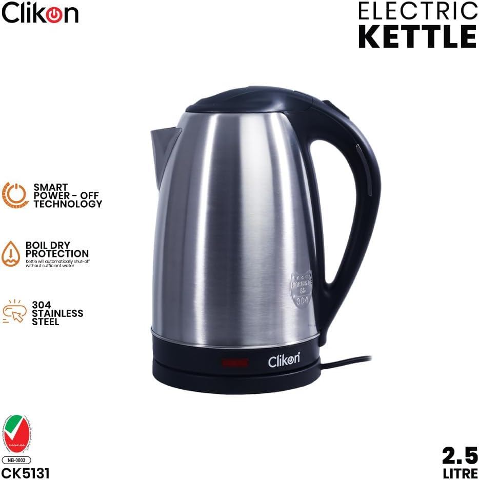 Clikon Stainless Steel Kettle- 2.5 LITRE – CK5131 Clikon – CK5131 – STAINLESS STEEL KETTLE- 2.5 LITRE, Has a Stainless Steel Design to blend in with your Kitchen Utensils.With up-to 2.5L capacity, you can boil Very Large amounts of Water in a short period of time.This Electric Kettle will replace the traditional way of boiling water from a gas stove, and eliminate the hassle of constantly monitoring the Gas stove every few minutes. Clikon – CK5131 – STAINLESS STEEL KETTLE- 2.5 LITRE , Has the Following :-2.5L CapacityHigh Grade (SS304) Stainless Steel BodyAuto Cut-OffBoil Dry protectionHeat resistant handle360 Swivel Base Power CordStorage Power Indicator Light To be the world’s most trusted brand by providing solutions for our customer’s needs and be the smart choice for the generations. To fervently surprise our customers with amazing products. Deliver the unmatched quality products with innovation, international standards and durability to our customers by constantly applying the latest technologies, trends and style. We at CLIKON strive to make your life easier with our products which is of Unmatched Quality Durability & Meets International Standards