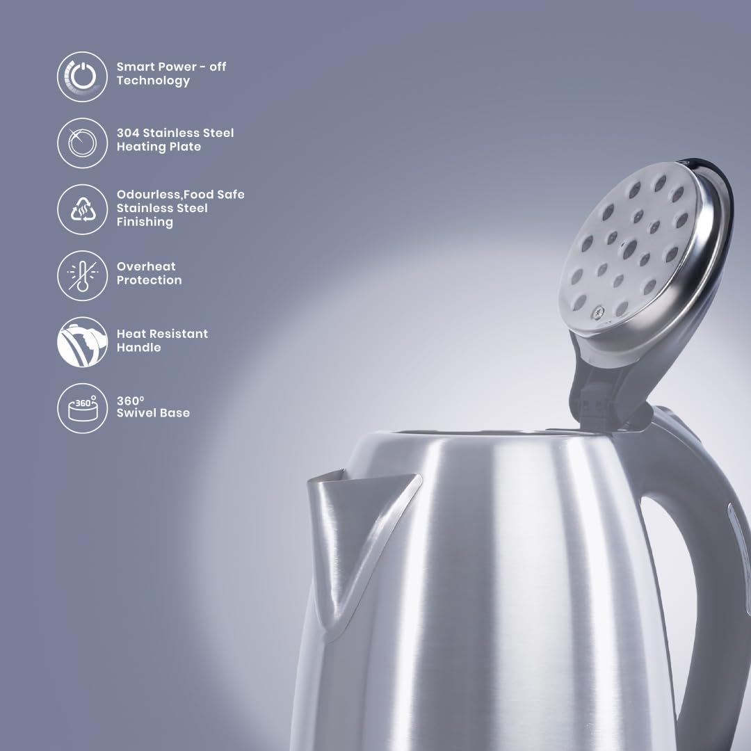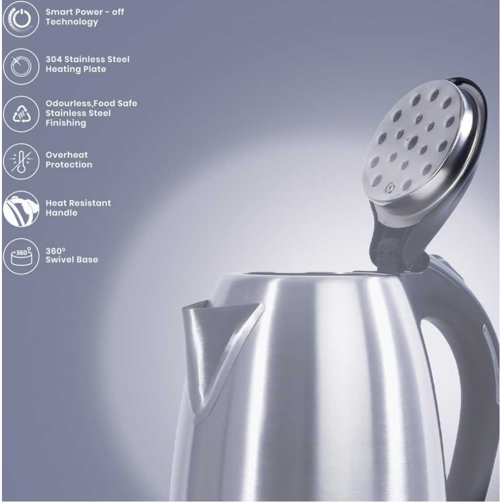 Key Features: Aesthetically modeled kettle is sure to add class and comfort to your kitchen Automatically stops the heating process when the water is boiled Power indicator light switches on when heating starts and switches off once the water is boiled Single touch lid locking mechanism makes operation easy on your fingers Easy-pour spout makes it easy to pour hot water without making a mess Flat heating element for boiling hot water in seconds. A concealed stainless steel heating element ensures fast boiling and easy cleaning Elegant indicator light incorporated in the power switch illuminates when the kettle is turned on A push-button lid opens smoothly at the touch of a button, avoiding steam contact. The large opening simplifies cleaning