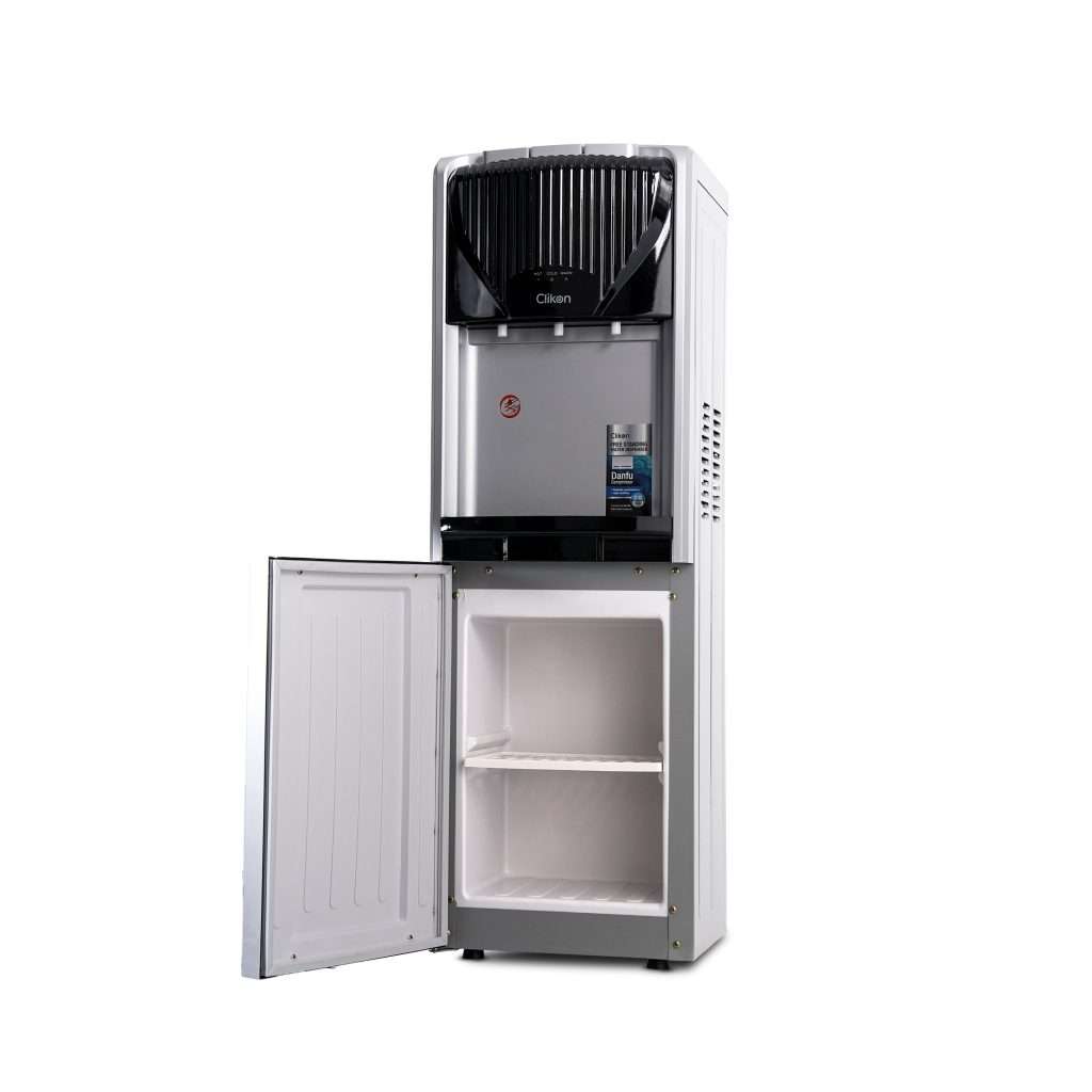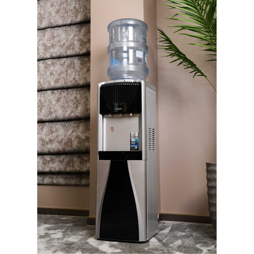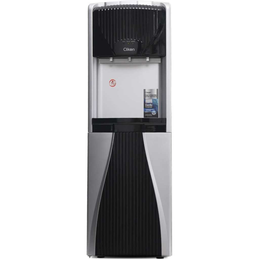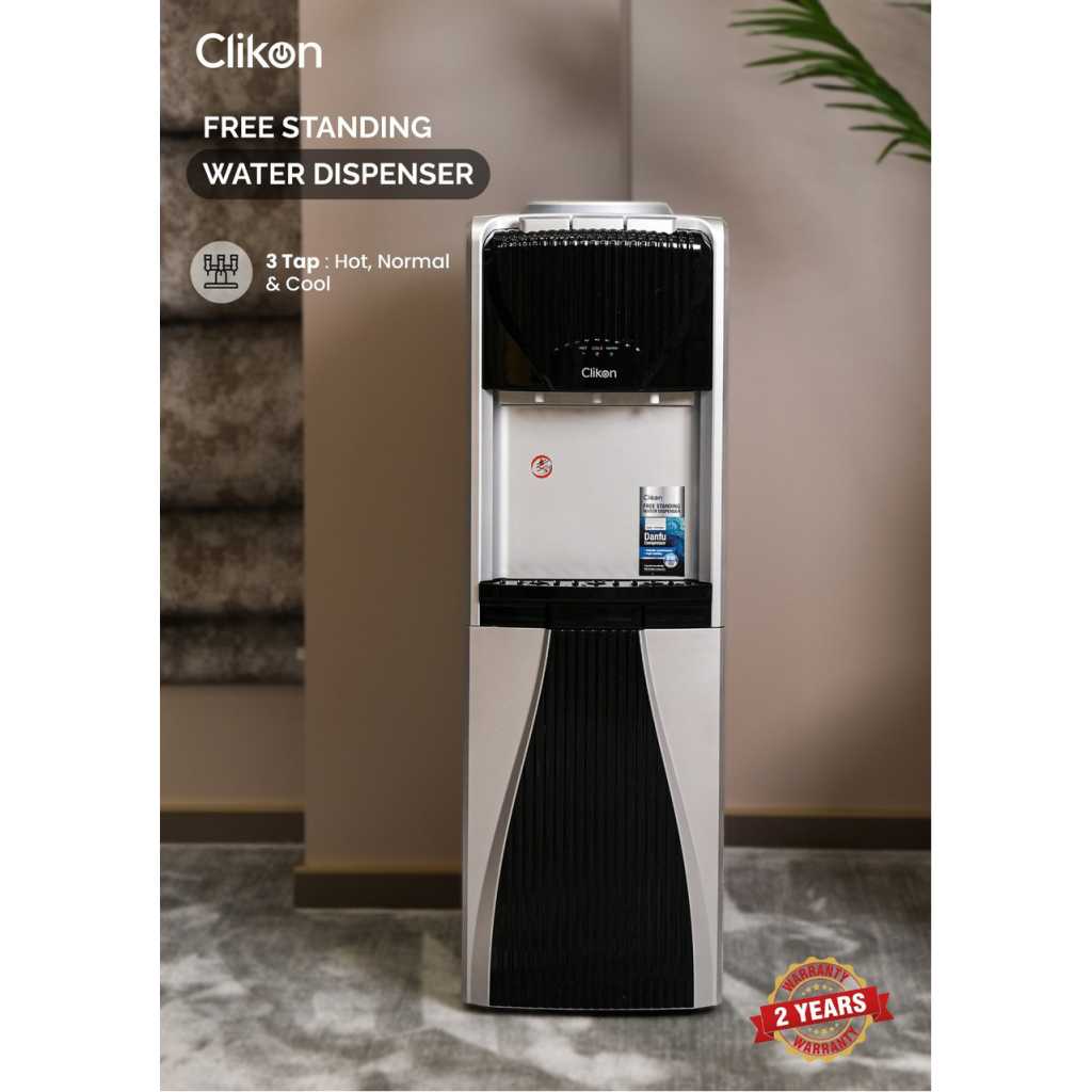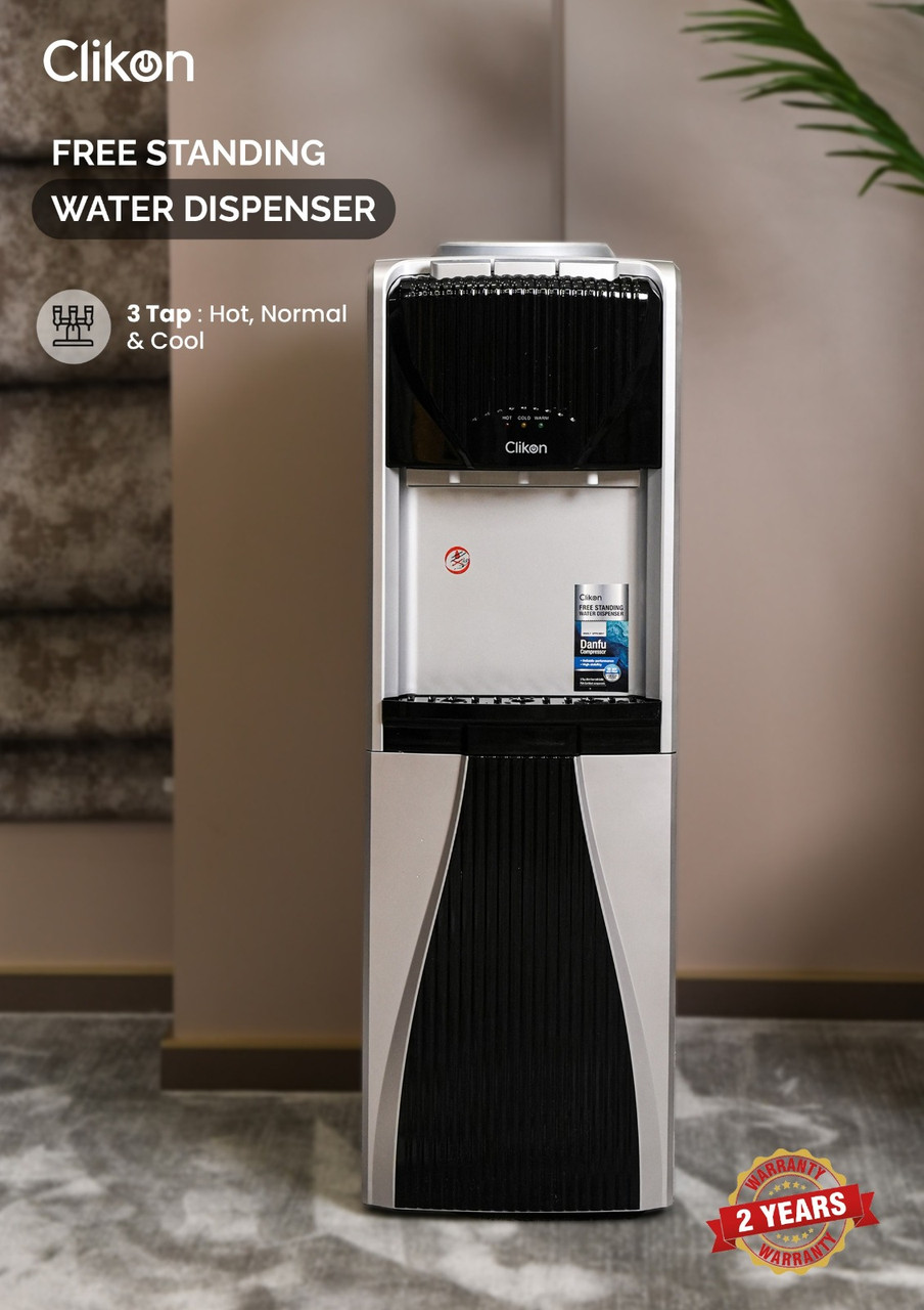 The Clikon Water Dispenser with a 3-tap design offers hot, cold, and normal water options, providing complete versatility for your hydration needs. Powered by a high-efficiency Danfu compressor using R134a refrigerant, it ensures superior cooling performance while being eco-friendly. The dispenser features a rust-proof SS 304 single stretch tank, ensuring durability and water purity for long-term use. Equipped with a child lock function for added safety and a convenient cabinet for storage, this dispenser is both practical and stylish. Operating at AC 220-240V 50/60Hz with 500W power, it delivers reliable performance with energy efficiency, making it a perfect addition to any home or office.