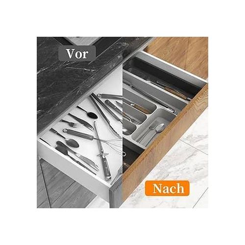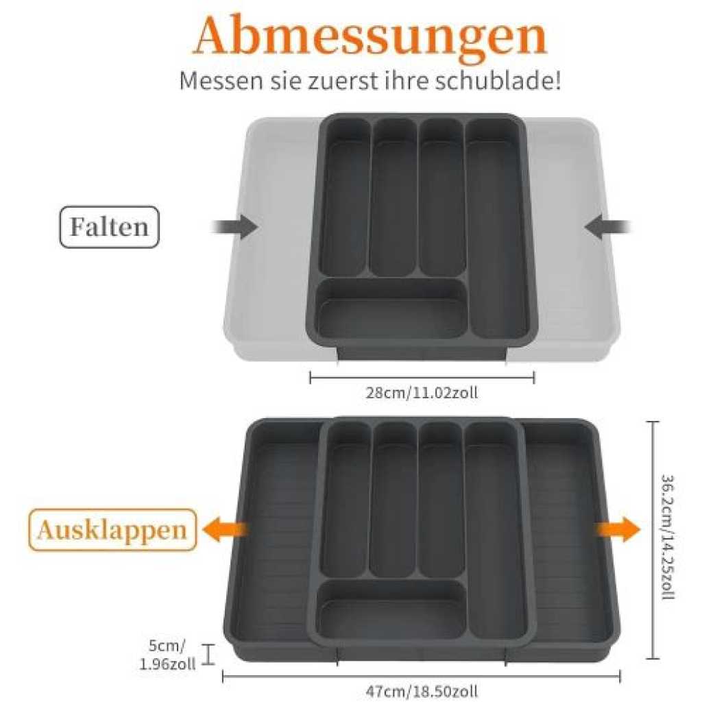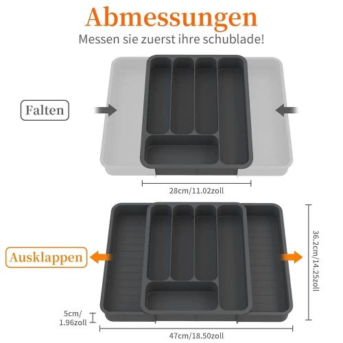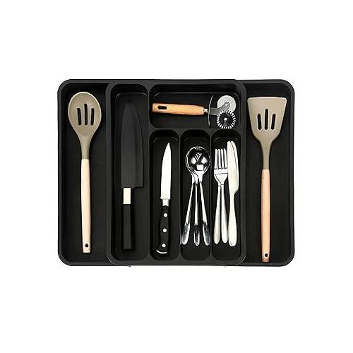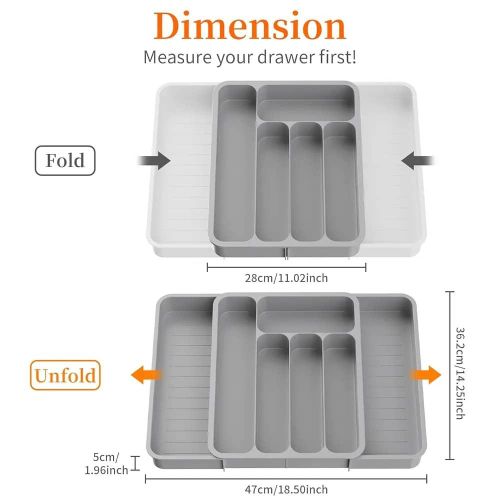 【Large Capacity】This silverware organizer has 7 compartments, which can efficiently classify and store most utensils in the kitchen, such as spatulas, ladles, knives, forks, spoons, whisks, etc., saving space on the kitchen countertop. 【Expandable & Adjustable】The kitchen utensil organizer has an adjustable width range of 11-19.7 in (28-50cm), fully expanded size is 19.7 x 14.3 x 2.1 in (50 x 36.4 x 5.3 cm), and the collapsed state size is 11 x 14.3 x 2.1 in (28 x 36.4 x 5.3 cm), suitable for most drawer sizes. Please measure your drawer before purchasing. 【Easy to Use and Clean】The adjustable cutlery silverware flatware holder is easy to use and clean, the edge design allows it to be moved easily. When cleaning, it can be rinsed directly with clean water and wipe with a clean rag (cannot be used in the dishwasher). 【Anti-slip Mats Design】The tableware storage box has anti-slip mats design on the bottom to prevent it from sliding on a flat surface or in a drawer, making it stable. And the cooking utensil organizer is made of BPA-free food-grade PP material, which can directly contact the tableware and can be used with confidence. 【Wide Range of Uses】Silverware organizer drawer has a large space and has different partitions. It can store various stationery, tools, tableware, knives and forks, cosmetics, toiletries, etc. It is used for drawers and countertops in bathrooms, garages, bedroom dressers, study rooms, and kitchens. use. Effective storage and quick access.