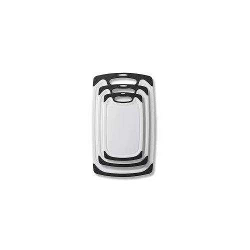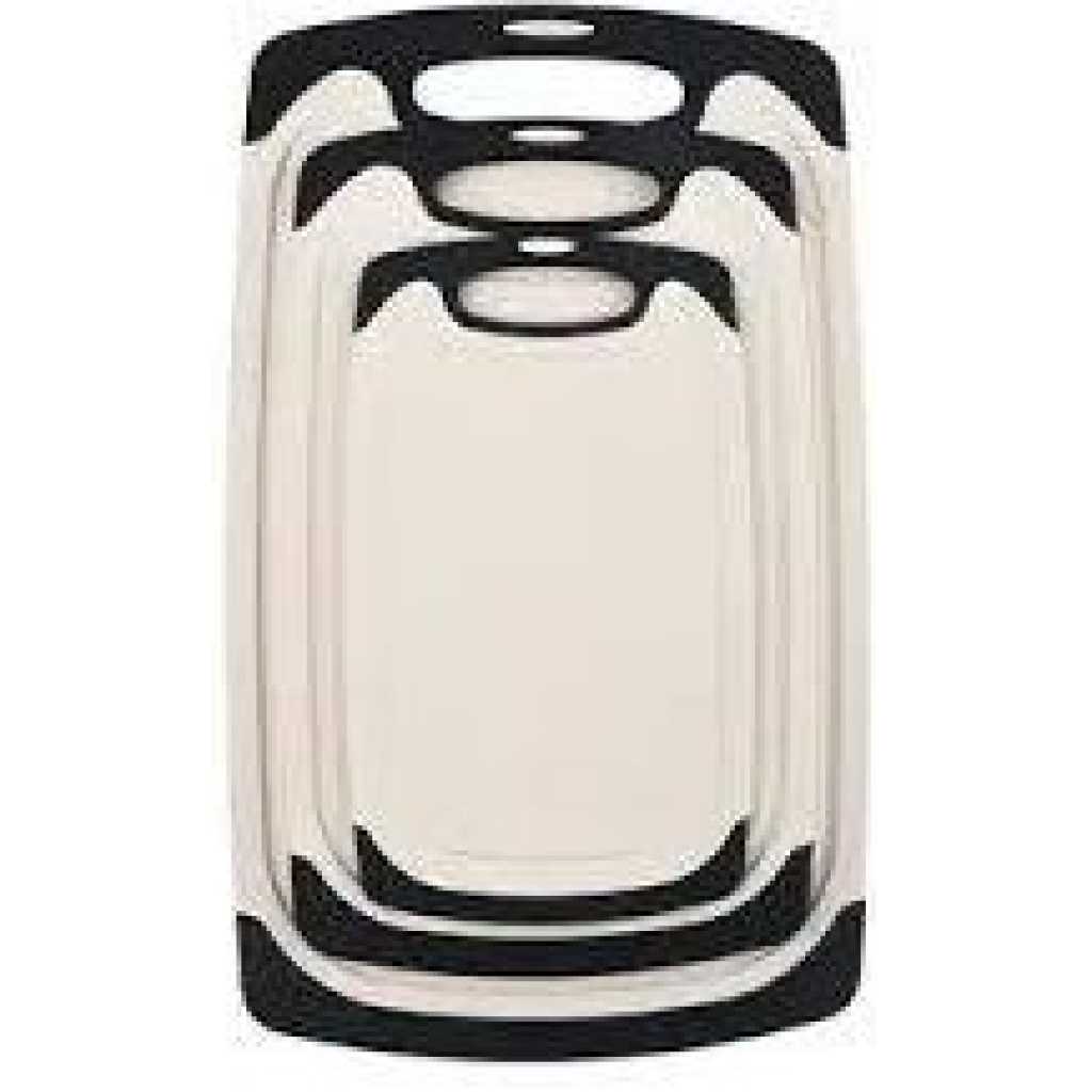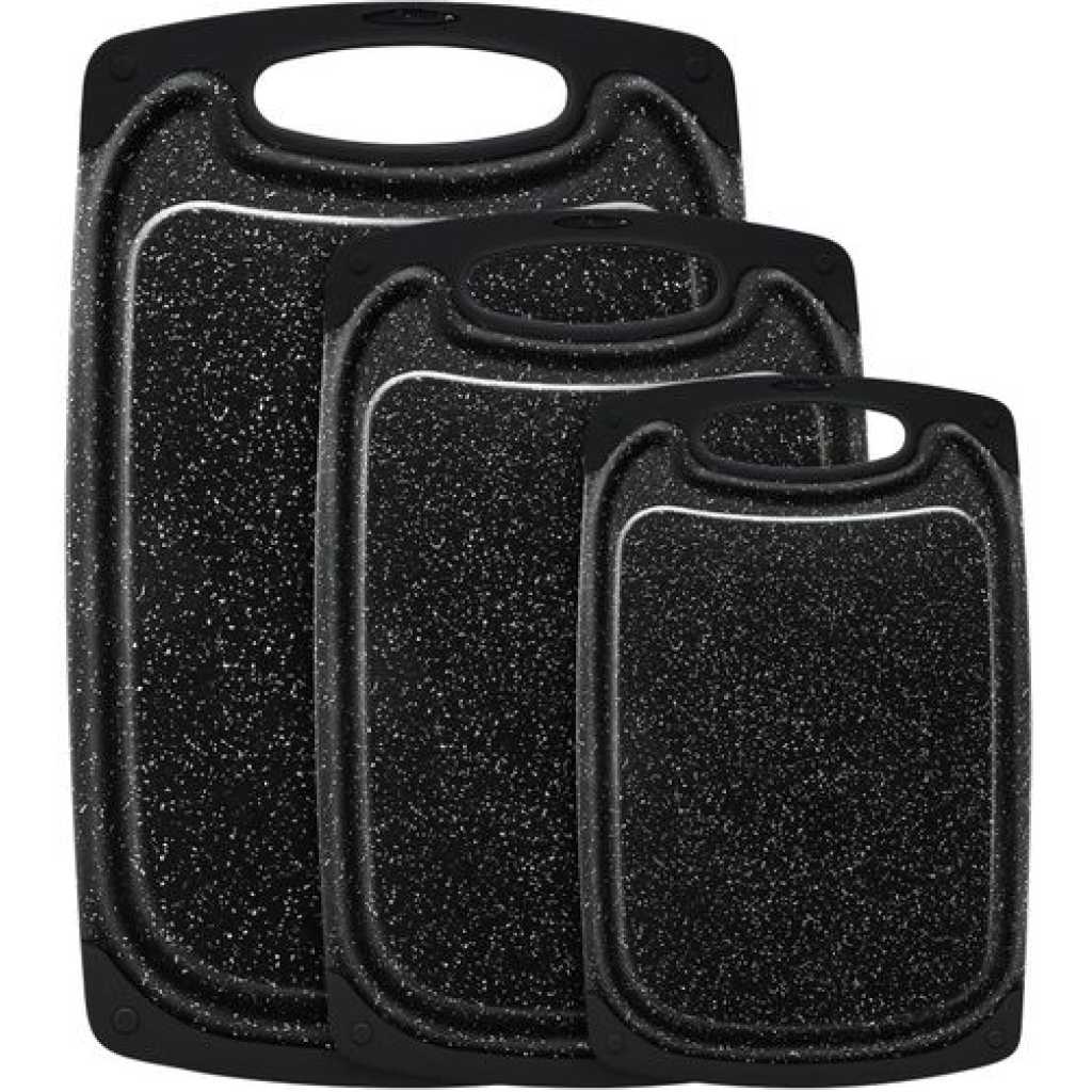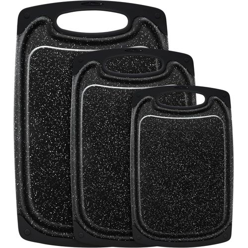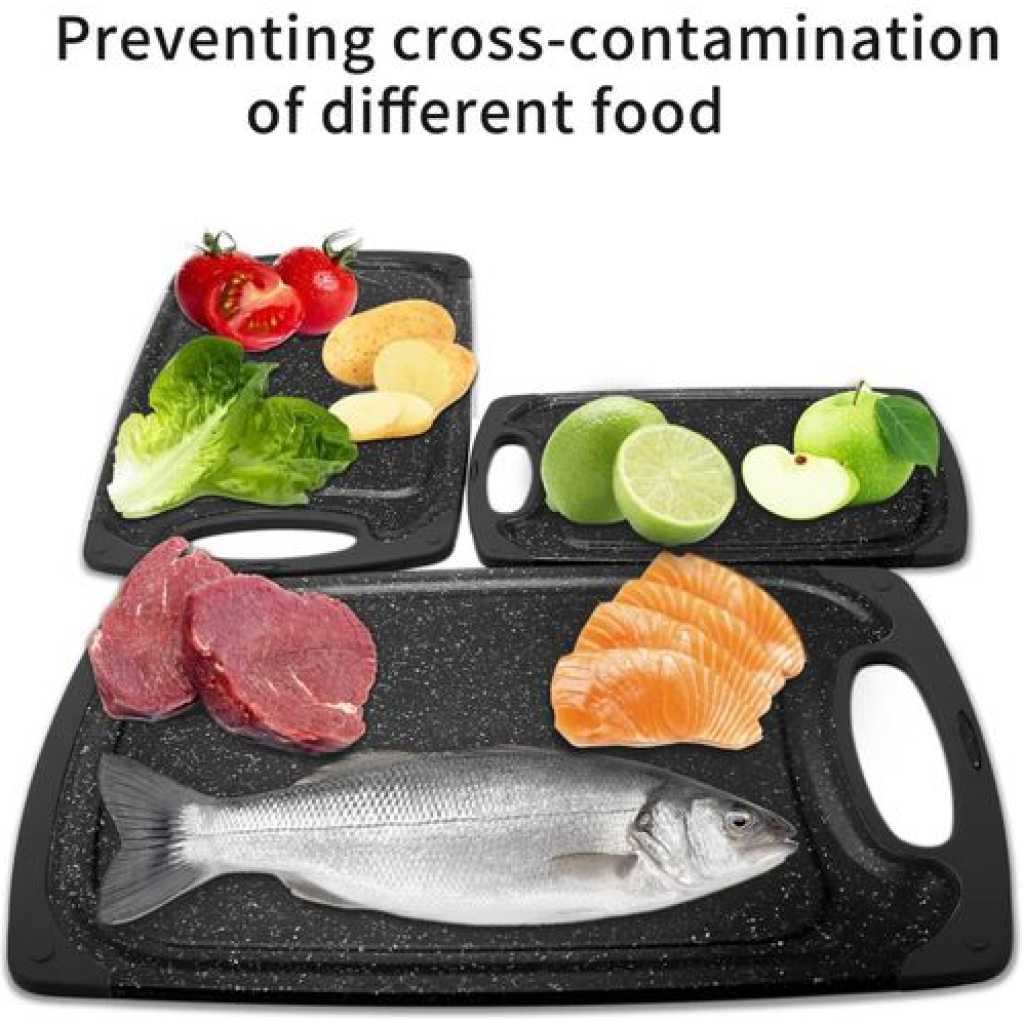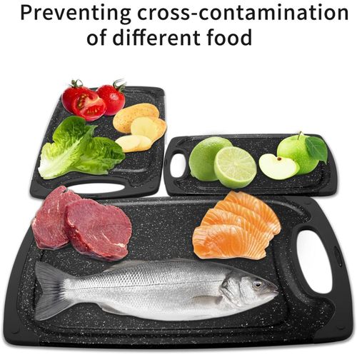 Premium quality: high-quality plastic with LFGB certifications. The chopping board set of 3 is made of excellent environmentally friendly PP plastic, it is completely free from harmful substances and does not smell of plastic. Perfect for cutting foods such as fruits, vegetables, cheese and meat. It is better than wood or bamboo as no bacteria can get into the material. Super preferable: one set of chopping boards includes three sizes: large (15.8 x 9.5 x 0.3 inches), medium (12.5 x 7.8 x 0.3 inches) and small (9.85 x 6 x 0.3 inches). You can choose a large plastic chopping board when cutting large meat, and when cutting fruit, a small chopping board, which is convenient for your life. Strong and lightweight: antibacterial and durable. Crack-resistant and lightweight. Grinding area for garlic, ginger and etc. Easy to use: cut and carve comfortably over your sink or kitchen surface. The kitchen boards are available in small and large. The boards are equipped with a drain groove to catch liquids wonderfully and keep your worktop clean. This set can be used as a cheese plate, for cutting bread, serving, as a sausage mat, when camping or for barbecuing. Easy to clean: dishwasher-safe is now a must in the kitchen. After chopping, chopping or preparing food, simply place the chopping boards in your dishwasher. Due to the high quality of the plastic used, they do not become porous, break or splinter.