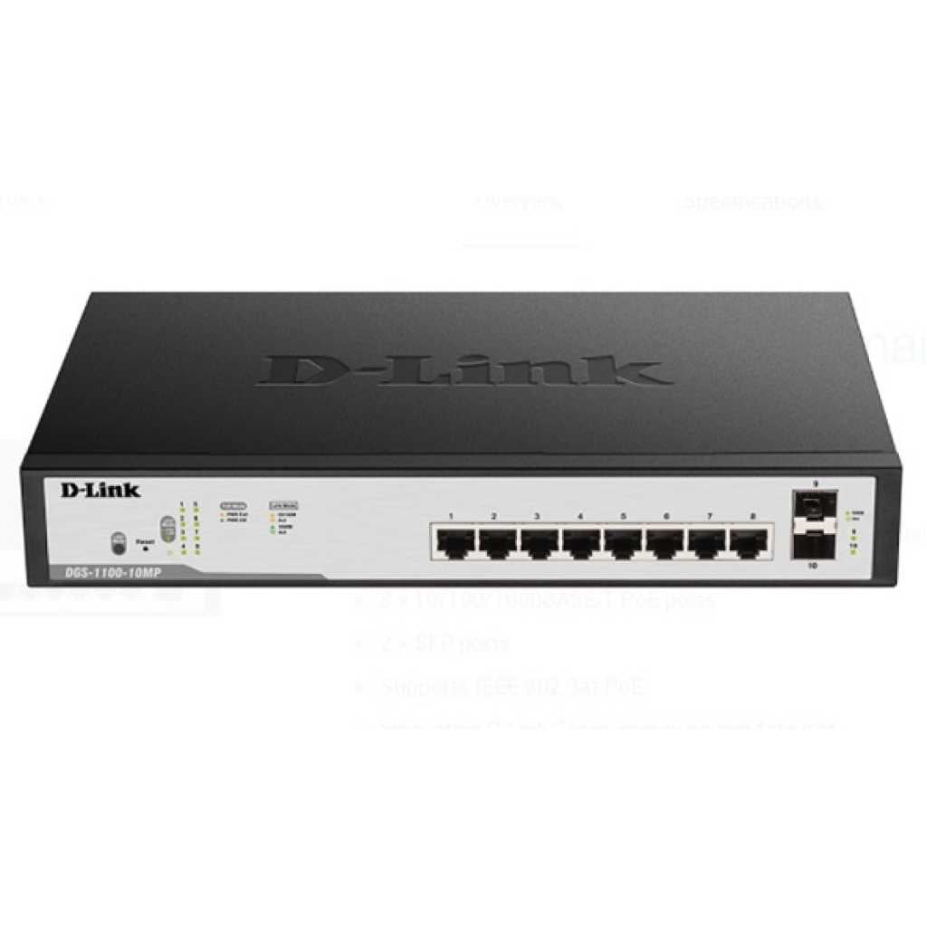 D-Link DGS-F1100-10PS-E 10-port Gigabit Smart Managed Switch, IPv6 Ready, Smart And Flexible Management, 8 x 10/100/1000BASE-T PoE ports 2 x SFP ports Supports IEEE 802.3at PoE, Innovative D-Link Green Energy Saving Features, Complete Web Interface, Comprehensive Switch Management, Smart Roaming, Seamless Network With The Same Network Name And Password, 6 Powerful Internal Antennas Per Unit DGS-F1100-10PS-E is a managed switch designed to meet the requirements of small, medium, and enterprise businesses. DGS-F1100-10PS-E supports multiple PoE standards make it ideal for IP surveillance deployments. Advanced management features, a range of diagnostic and troubleshooting tools, and energy efficient technologies provide a flexible solution to meet your networking requirements. Smart and Flexible Management Powerful switch management functions can be performed through the web management interface or through the client-based utility Gigabit Ethernet Speed High-speed ports provide the latest Ethernet technology while remaining backward compatible for connections to older computers and equipment. IPv6 Ready IPv6 compliance means that the switches are ready to meet future addressing standards, and are compatible with both your IPv4 and IPv6 network