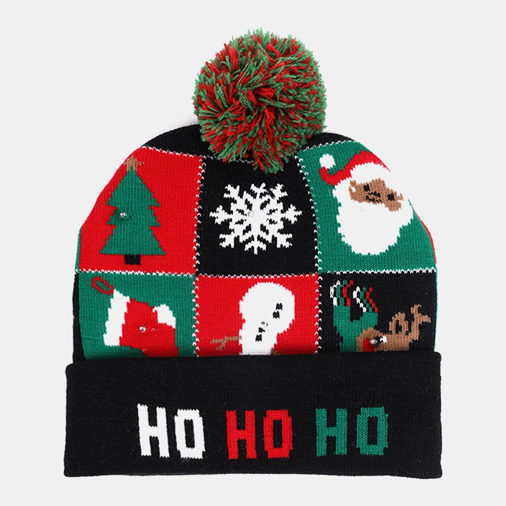 Dětský a dospělý klobouk Jacquard s potiskem písmeny, vzorem karikatur a světelným LED světlem vhodný na Štědrý den