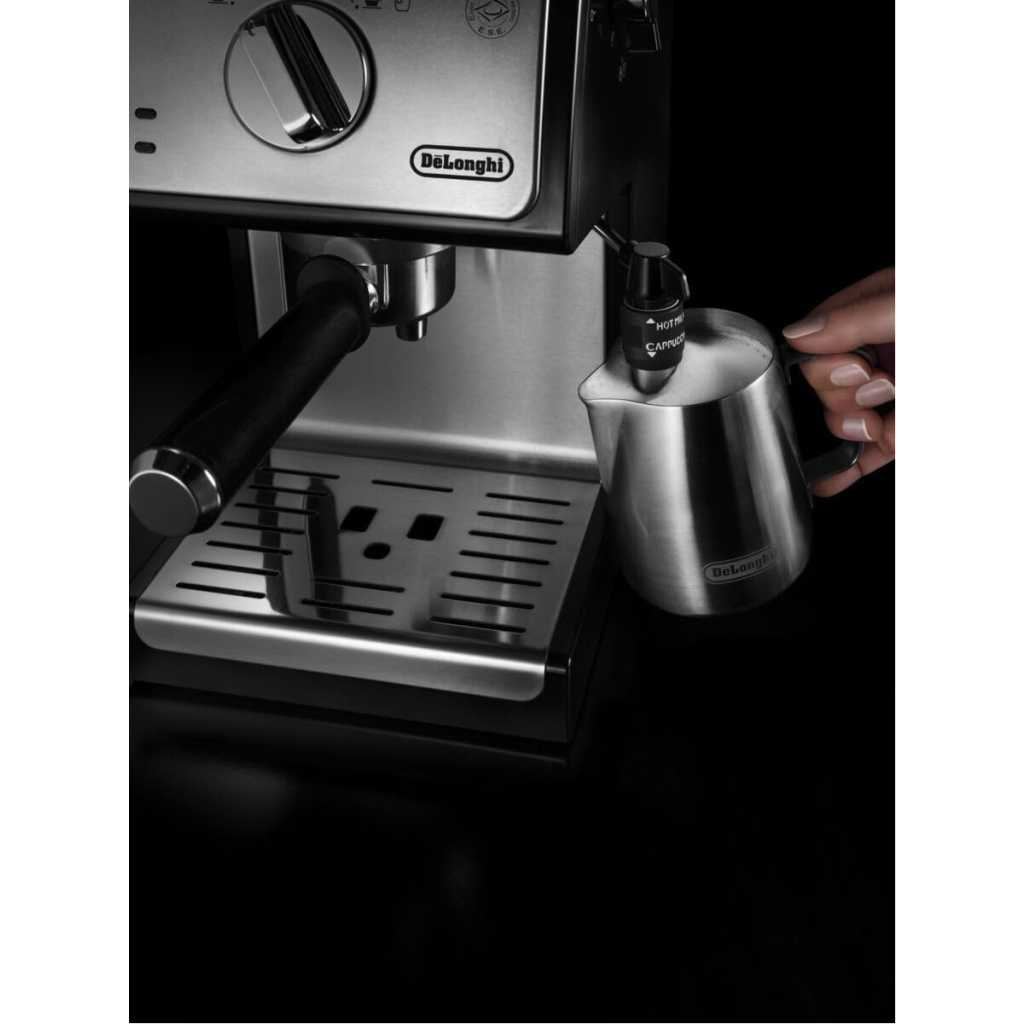 Key Features: Authentic Barista Experience: Enjoy rich, flavourful espresso, cappuccino, and lattes with the De’Longhi ECP35.31 Traditional Barista Pump Espresso Machine, featuring a premium finish and sleek black design for a professional coffee experience at home. Customizable Milk Frothing: Create perfect frothy milk for cappuccinos or silky microfoam for lattes with the adjustable milk frother, designed to elevate your coffee creations to café-quality levels. Versatile Brewing Options: Use your choice of ground coffee or convenient E.S.E pods, providing flexibility and ease of use to brew your favourite coffee style effortlessly. Convenient 1-Litre Water Tank: The transparent, removable water reservoir offers a generous 1.1-liter capacity, ensuring minimal refills and easy monitoring for a hassle-free coffee-making experience. Flexible Double Drip Tray: Accommodates taller cups with its removable double drip tray, making it easy to prepare a wide variety of coffee drinks, from espresso shots to larger latte glasses.