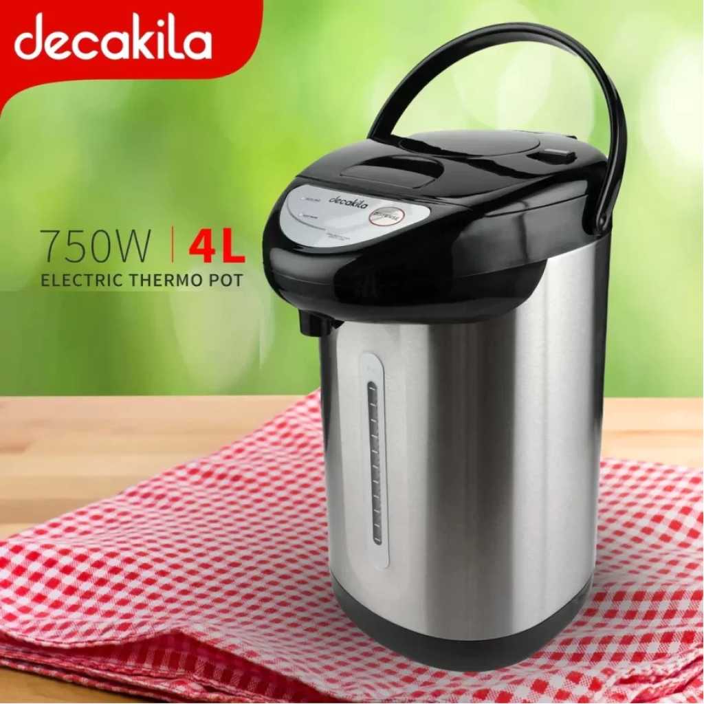 Key Features: Decakila 4 L, 750 Watts, Electric thermo pot, KEKT029B. 3 ways of dispense: (1) electric pump (2) manual pump (3) cup touch Dry heating protection With a Safety lock on the manual pump Generous 4-liter capacity Powerful 750W performance Automatic boil and keep warm functions Three dispensing options: electric pump, manual pump, and cup touch Dry heating protection for enhanced safety Safety lock on the manual pump Visible water mark for easy monitoring