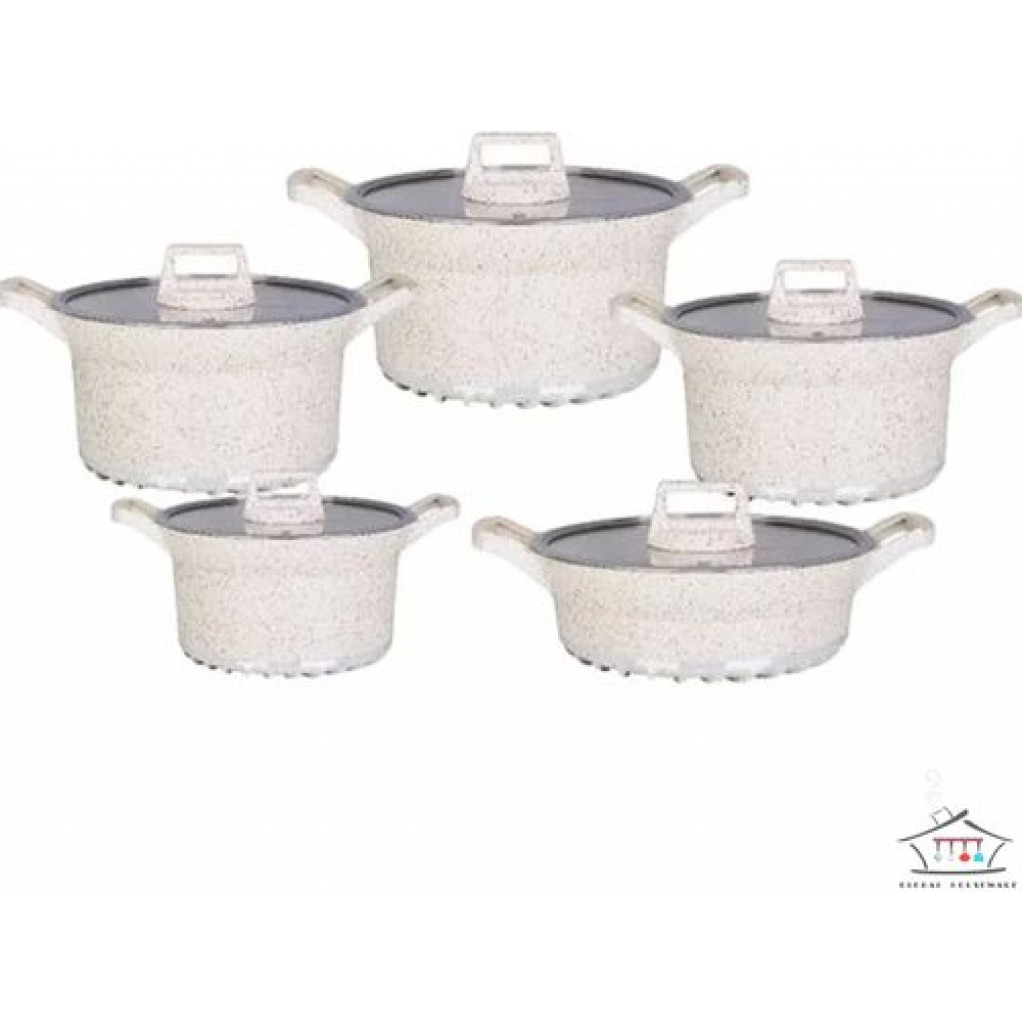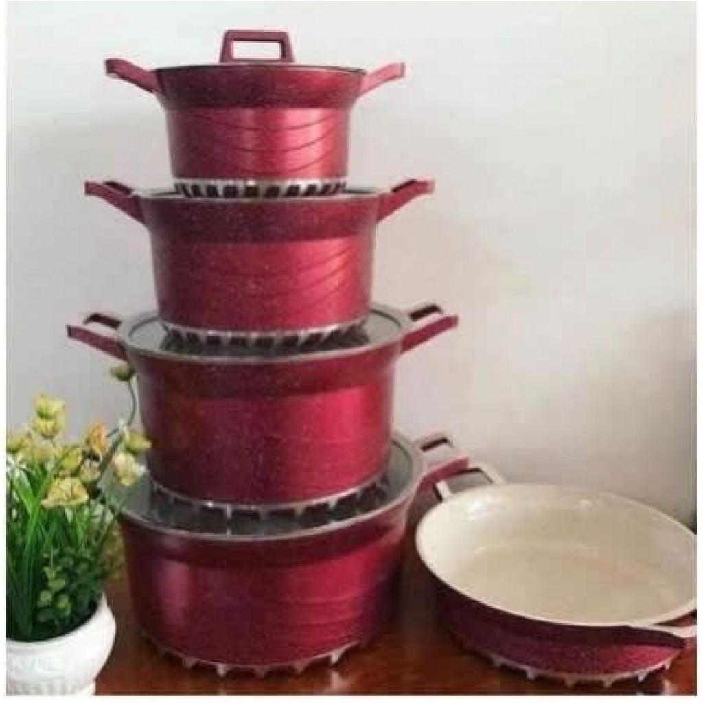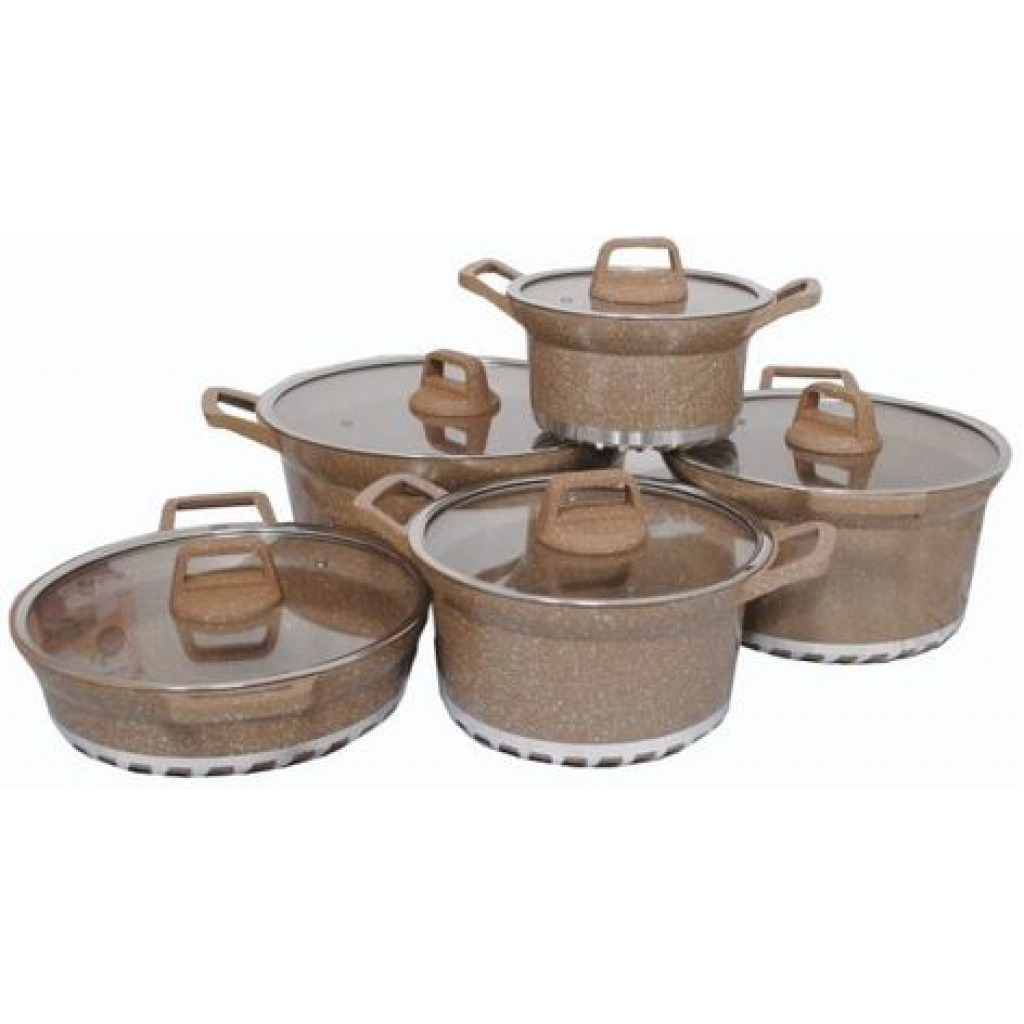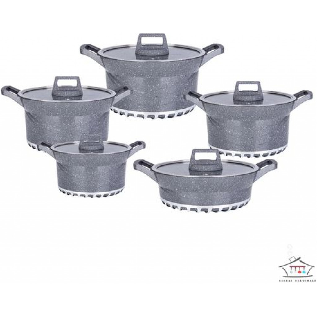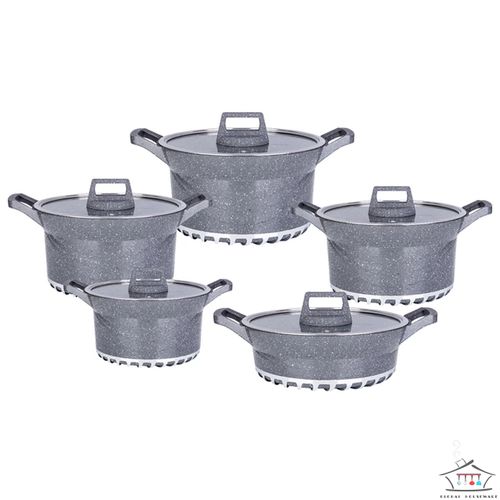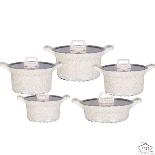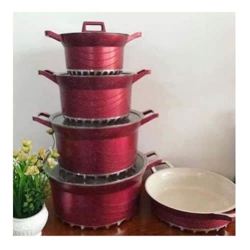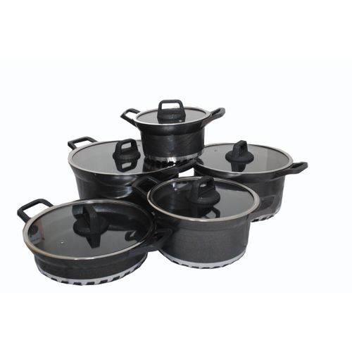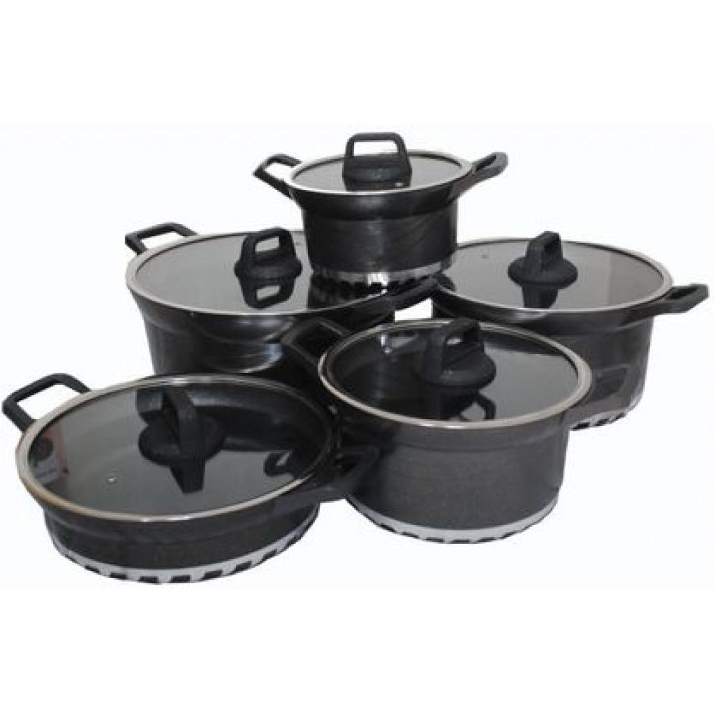 Key Features: 10 Piece Soup Pots Premium Die-Cast Aluminium Body Oven safe, Dishwasher safe, PFOA FREE Durable Non-Stick Coating Sturdy Tempered Glass Lids with Steam Vent Moulded Side Handles