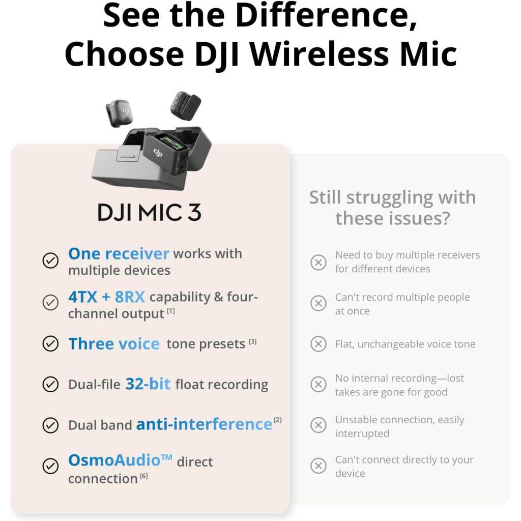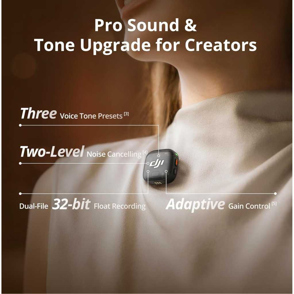 Lightweight & Intuitive, Compact Storage [9] – Take it anywhere—this wireless mic fits in your pocket or bag, ready for travel vlogs, street interviews, or capturing ideas on the go 4TX + 8RX Capability & Four-Channel Output [1] – This lavalier mic’s receiver can pair with 4 TX and sync audio to 7 additional RX—ideal for podcasts or group interviews Consistent, Balanced Audio in Every Scene – Whether you’re whispering or shouting, this wireless mic’s adaptive gain control [5] keeps your audio crisp in busy cafes or outdoor adventures Sound Your Best, Anywhere You Record – Choose from three voice tones [3] and two noise-cancelling [5] levels of this wireless mic to match your vibe—cut the noise in studios, parks, or city streets Crystal-Clear Audio, Even in Crowded Spaces – Dual-band anti-interference [2] of this wireless mic ensures flawless, lossless audio transmission, even at live events or in busy offices Never Lose a Take with Pro-Grade Backup – Worried about audio clipping or missing takes? Dual-file 32-bit float internal recording of this wireless mic captures every detail for your peace of mind Includes two DJI Mic 3 TX, one RX, a charging case, a Mic 3 mobile phone adapter (USB-C), and more. Record two voices easily and stay powered for up to 28 hours of filming
