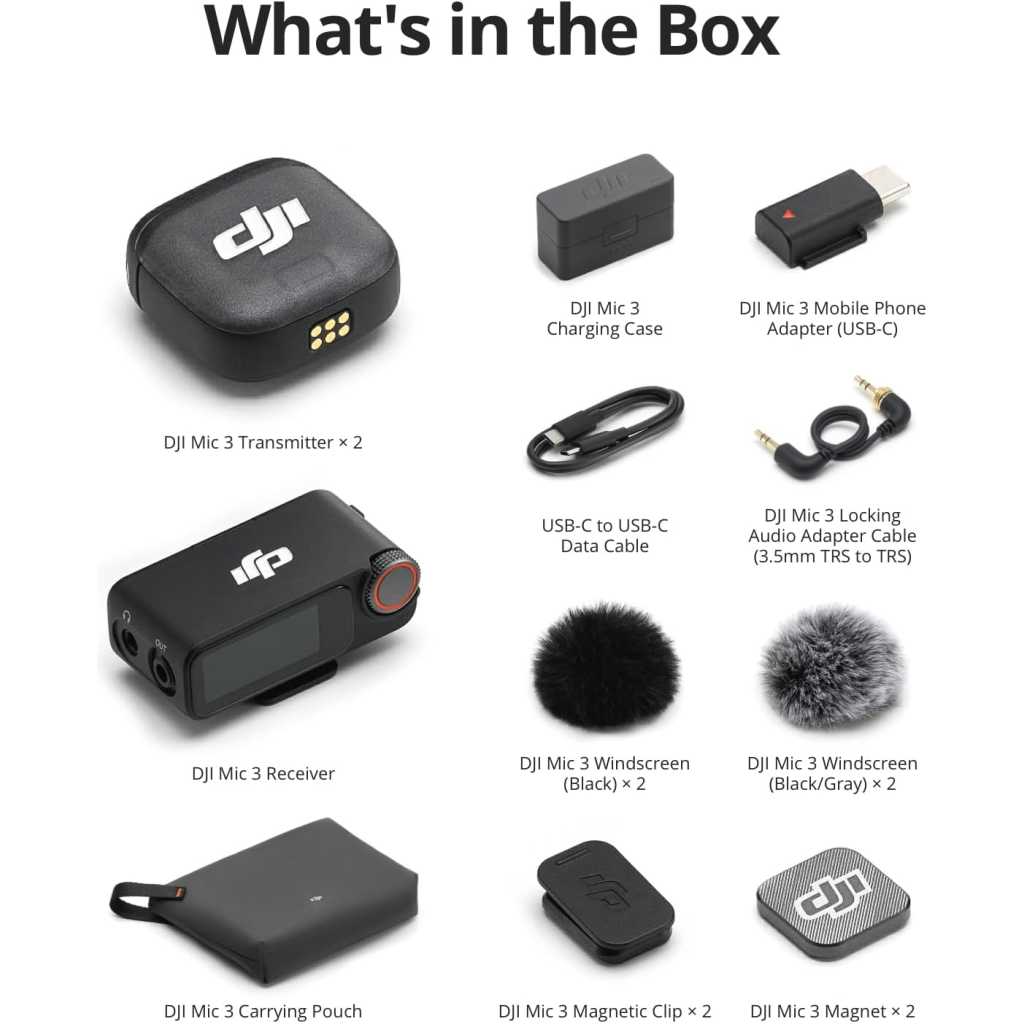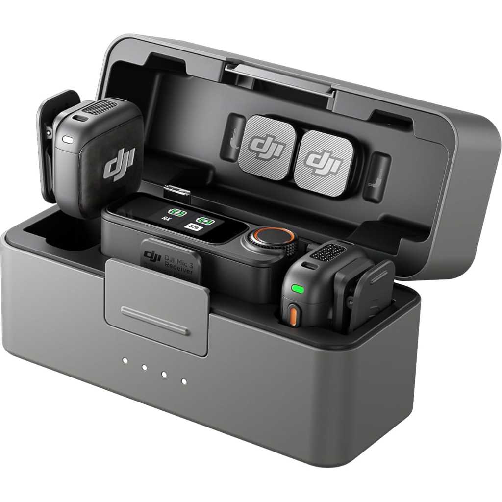 Key Features: Lightweight & Intuitive, Compact Storage [9] – Take it anywhere—this wireless mic fits in your pocket or bag, ready for travel vlogs, street interviews, or capturing ideas on the go 4TX + 8RX Capability & Four-Channel Output [1] – This lavalier mic’s receiver can pair with 4 TX and sync audio to 7 additional RX—ideal for podcasts or group interviews Consistent, Balanced Audio in Every Scene – Whether you’re whispering or shouting, this wireless mic’s adaptive gain control [5] keeps your audio crisp in busy cafes or outdoor adventures Sound Your Best, Anywhere You Record – Choose from three voice tones [3] and two noise-cancelling [5] levels of this wireless mic to match your vibe—cut the noise in studios, parks, or city streets Crystal-Clear Audio, Even in Crowded Spaces – Dual-band anti-interference [2] of this wireless mic ensures flawless, lossless audio transmission, even at live events or in busy offices Never Lose a Take with Pro-Grade Backup – Worried about audio clipping or missing takes? Dual-file 32-bit float internal recording of this wireless mic captures every detail for your peace of mind Includes two DJI Mic 3 TX, one RX, a charging case, a Mic 3 mobile phone adapter (USB-C), and more. Record two voices easily and stay powered for up to 28 hours of filming