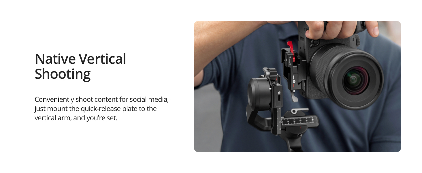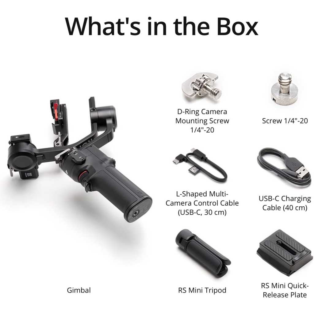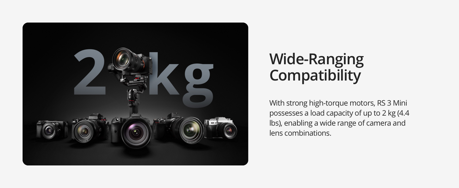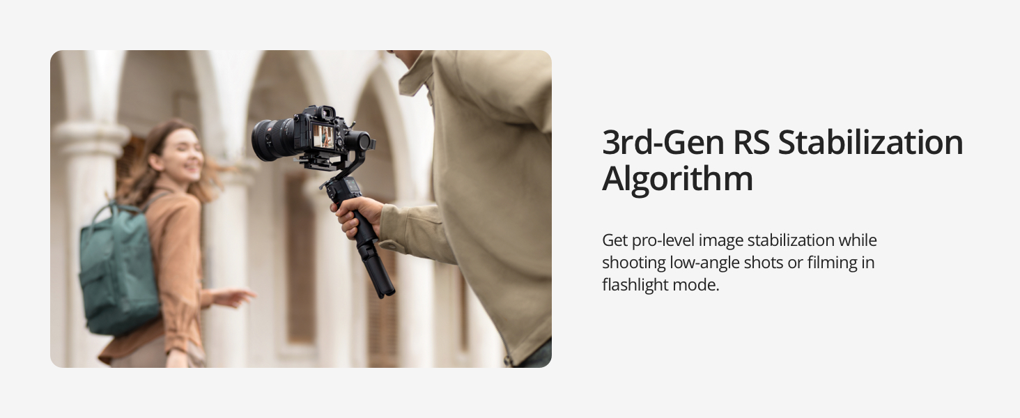 Key Features: 795g (1.75lbs) Lightweight and Portable – RS 3 Mini is an ultra-compact camera stabilizer convenient for travel. Weighing only 795g (1.75 lbs), RS Mini 3 is easy to hold for extended shooting. Wide-Ranging Compatibility – With strong, high-torque motors, the RS 3 Mini camera stabilizer possesses a load capacity of up to 2 kg (4.4 lbs), enabling a wide range of camera and lens combinations. Bluetooth Shutter Control – Your camera automatically reconnects after the initial pairing. Easily control photo capture and video recording via the gimbal. 3rd-Gen RS Stabilization Algorithm – Get pro-level image stabilization while shooting low-angle shots or filming in flashlight mode. Native Vertical Shooting – Conveniently shoot content for social media, just mount the quick-release plate to the vertical arm, and you’re set. 1.4″ Full-Color Touchscreen – The compact camera gimbal features a 1.4-inch full-color touchscreen displaying a new, intuitive UI design. Access frequently used settings at your fingertips.