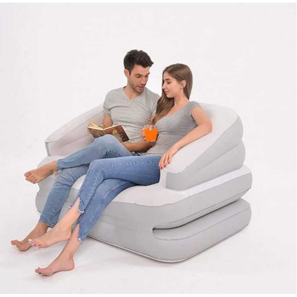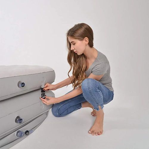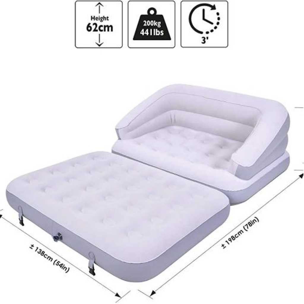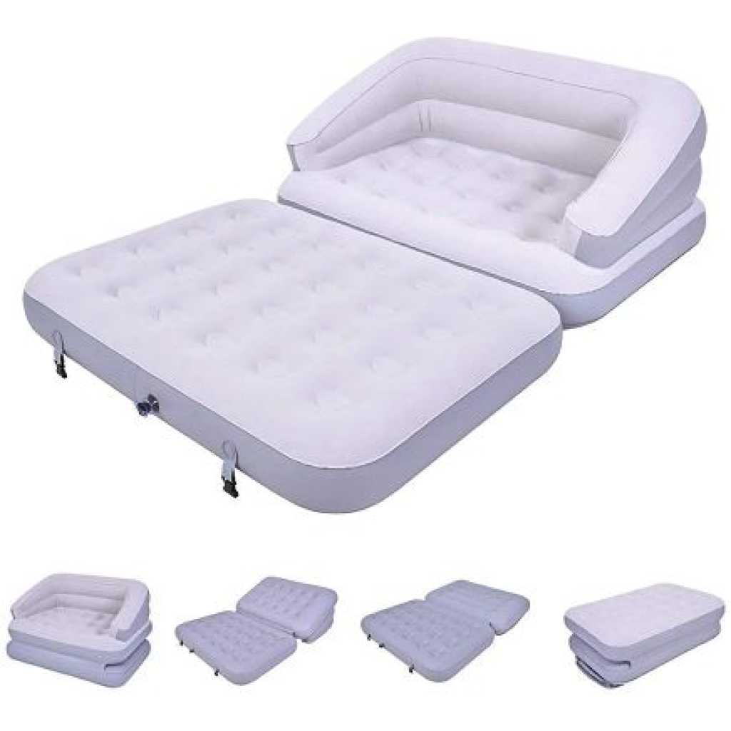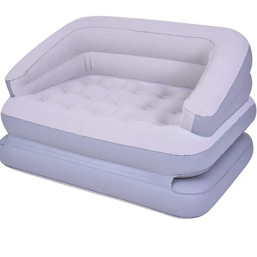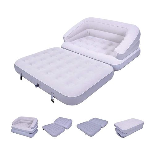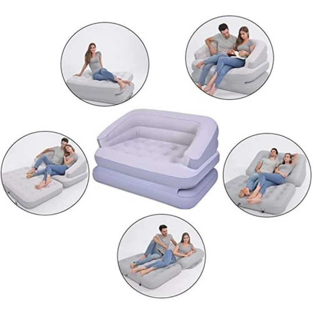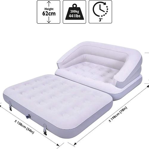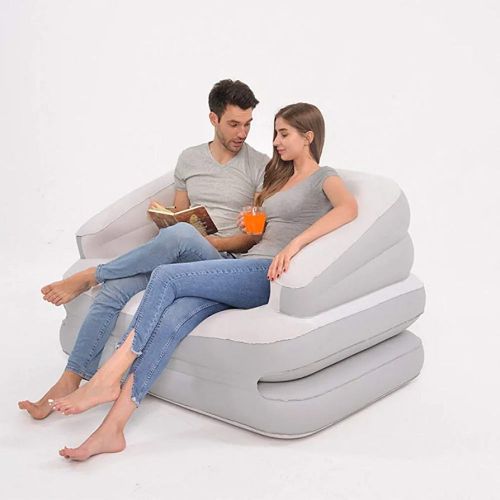 Double Air Couch Folding Sofa Bed Inflatable MattressPool Float Waterproof Blow Up Sofa For Camping Pool Bedroom Overnight – Grey. Air Lounge Inflatable Comfort Sofa Bed is best for indoor or outdoor summer temperatures. Inflatable armchair with backrest, it is comfortable to sit on. Thanks to the soft velvet and non-slip. Need a sofa as well as a bed for your space but thinking of the storage capacity of your house? Then you should thank it, because this product, a money saver, space saver, will enhance the beauty of your house. Do not think of the storage space; Just release the air through the three quick-release valves and for more use the deflation port on the AC pump to suck out the remaining air. Then fold up the sofa bed and chair and arrange them in the carry bag easily. An elegant, beautiful product airbed perfect for two or three persons as a short-term sleeping solution or for guests for sitting. Its material is PVC vinyl. Very easy to clean or repair if any kinds of mishaps occur. It comes with a patch kit. With a detachable AC pump with nozzles and a lightweight carry bag, you will get FREE to take everything with you anywhere. TRAVELER multi-functional PVC sofa bed can satisfy your needs, you can use it camping, in water, and ground. Blast-resistant construction, high stability, high resilience, and high flexibility. Product Dimension: 78 x 54 x 24 Item Weight: 10.2 pounds Max. weight capacity: 450 pounds 5 in 1 Air Lounge – Sofa Bed, Free Air Pump Included. Environmental friendly material and has no side effects on the human body Suitable for Household, Camping, and Easy carry. Special gift for your Friends & Family It serves both the purpose of seating and sleeping as it can be converted from a sofa to a bed. NOTE: Do not over-inflate.Use caution when inflating with an air compressor.