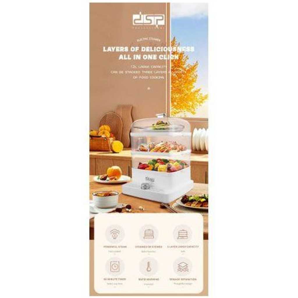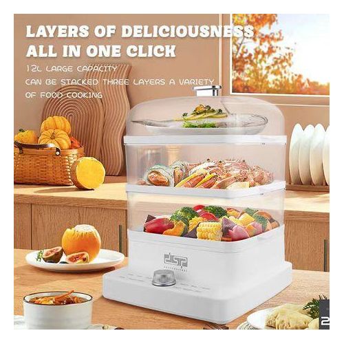 Dsp 1300ML 3 Tier Electric Vegetable Food Steamer Cooking Pot- White – The electric food steamer has a big power of 1200W along with 1300ML large water capacity for long steaming time and 3 adjustable rack layers free combinations to meet various needs as well as 30 30-second steam outlet. – Through smart innovation and intelligent design, Sunbeam aims to make everyday tasks at home simpler and easier. Whether it’s cooking, cleaning, organizing or even entertaining, this quality appliance range offers practical solutions to suit every need. Features voltage – 220 / 240V ~ 50/60Hz output – 1000 / 1200W capacity 3 layers – 4L water tank – 1300ML body materials – PA & PP – On / Off switch – 3 host layers – top / evaporate layer – second / drain pan layer – third / water tray layer Food Display grains – 30/40 min stewing – 35/45 min rice – 25/35 min meat – 30/40 min steamed cake – 20/30 min chicken – 30/40 min pasta – 10/20 min seafood – 15/25 min egg custard – 10/25 min vegetable – 10/20 min dessert – 8/12 min warm – 5/10 min What’s in the box 1x Electric Steamer 3x Rack Layers