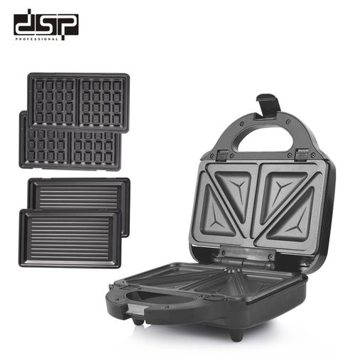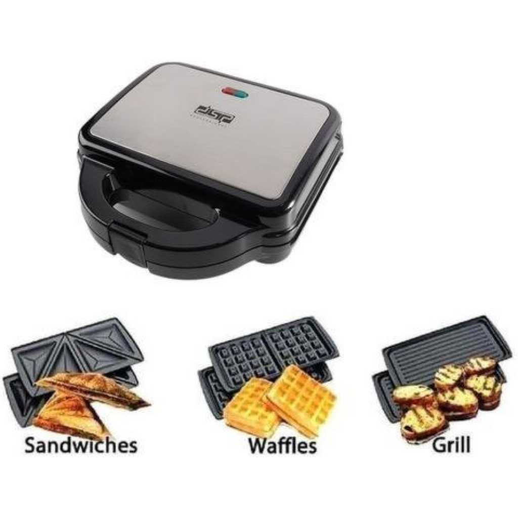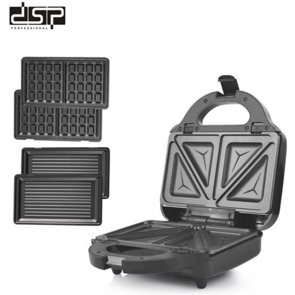 Key Features: Dsp 3 in-1 Waffle Maker Sandwich Barbecue Electric Baking Pan Toaster – Black. 3 in-1 Multi-Function: 3 in 1 Sandwich Maker offers 3 removable plates(sandwich, waffle, and grill). Perfect for making sandwiches, waffles, barbecues, steaks, etc. The sandwich maker presses sandwiches, grills omelets, and more in one product. Simple and efficient Powerful Sandwich Maker: With 700-800 Watts of power, the sandwich maker reaches the cooking temperature quickly in 3-5 minutes, and double cooking plates heat evenly that are crispy outside and tender inside. Power on and preheat indicator lights to let you know when the plate is ready for cooking Compact Design and Storage: The portable sandwich machine is built for small spaces and outdoor use, it can be carried and stored upright or lying flat to save space. Perfect for travel, dormitory, and all-sized kitchens, enjoy delicious food anywhere, anytime Safe and Stable: The high-precision thermostat keeps the temperature stable. The design of non-slip feet and insulated handles ensure safe operation to avoid burn risk. Cool-touch locking handle for safe operation and convenient portability Easy to Clean: High-quality non-stick coating grill plates for effortless food release and easily detachable, water and oil-repellent, and easy to clean. The nonstick plates and drip tray are dishwasher safe.