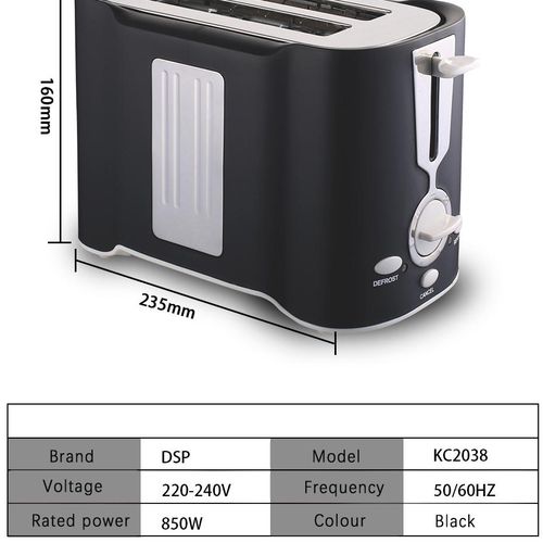 Key Features: Dsp Light Food 2 Slice Electric Breakfast Bread Toaster Oven -Black, White 2 slice toaster 1x DSP 2 Slice Toaster What’s in the Box: Frequency: 50/60Hz Voltage: 220 – 240V Anti Slip Rubber Feet Multi Functional Use Cord Storage Under Base Variable Browning Control Compact Size Easy to Clean Detachable Crumb Tray Auto Pop-Up Function