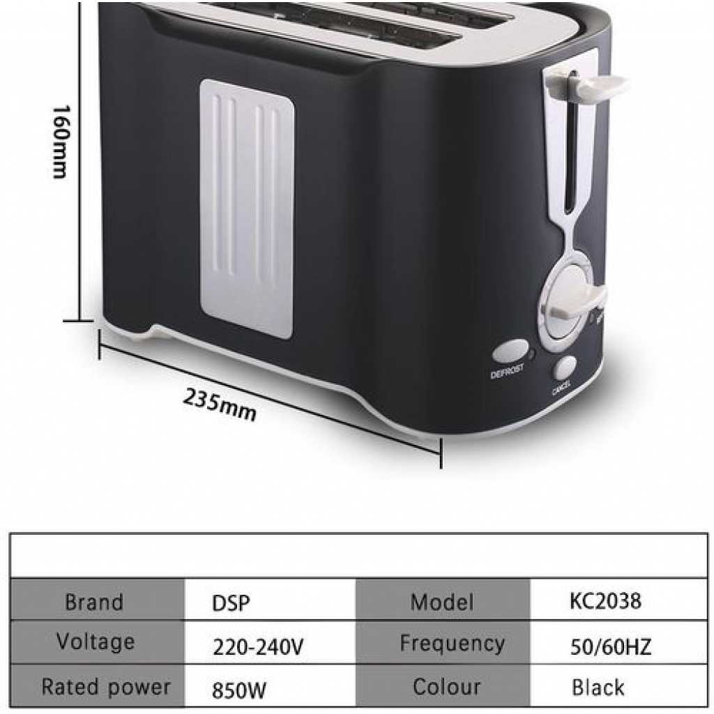Dsp Light Food 2 Slice Electric Breakfast Bread Toaster Oven -Black, White Enjoy freshly toasted bread every morning thanks to the DSP 2 Slice Toaster. it toasts bread evenly and consistently every time. Equipped with the variable browning control to ensure you have your toast the way you want it. When the bread is ready it pops up for your convenience. It has a cool touch to make sure you never burn yourself. Now watch that butter glide on your warm toasted bread. Enjoy!