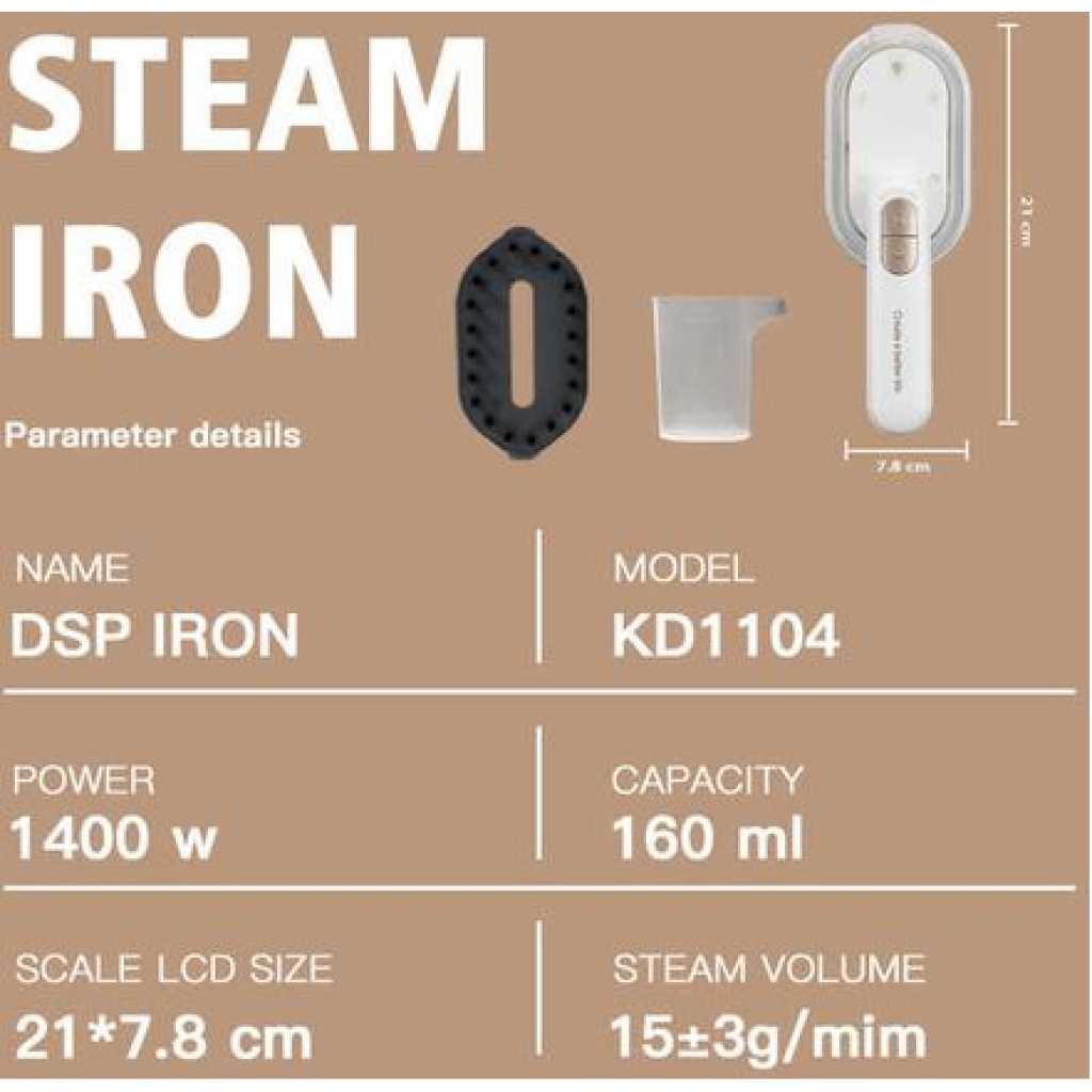 Key Features: Dsp Portable Micro Handheld Cloth Garment Steamer Iron Machine- White. Powerful& Continuous Steam: 160ml Visual Water Tank to help you clearly observe the water level and easy to add water in time. Plugged in and ready to use, it only takes the 30s to finish heating. The internal double-flow steam technology makes the steam strong and dense with a continuous steam volume of up to 15g/min. The dense dry steam can make the clothes flat immediately, but it won’t make clothes wet. Multi-Function: Our steam iron can both hang and flat iron, and has both dry ironing and wet ironing modes, which can be applied to various fabrics. The soleplate is coated with a ceramic glaze for smooth use and no damage to your clothes. Rich Accessories: Equipped with an insulated base, you can easily place the iron after heating to avoid burns. With a removable brush to brush away dirt and smooth out lint on clothes. A water cup makes it convenient for you to fill the iron with water before use. Portable & Practical: Our steam iron features a rounded design and hidden water tank which make it beautiful, compact, and practical. The handle folds 180° and comes with a storage bag for easy storage. Weighing only 1.5 pounds, the steam iron is a good choice for home or travel and business. Circular arc design, no dead angle in ironing. Safe To Use: Our steam irons are double protected with smart temperature control and fuses so you can use them with peace of mind. A simple one-touch start design makes operation more convenient. If you have any problems with use, please contact us, we will do our best to help you.