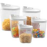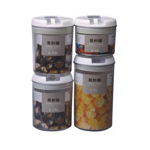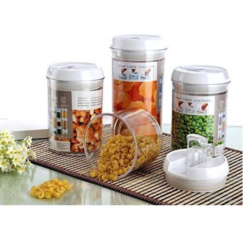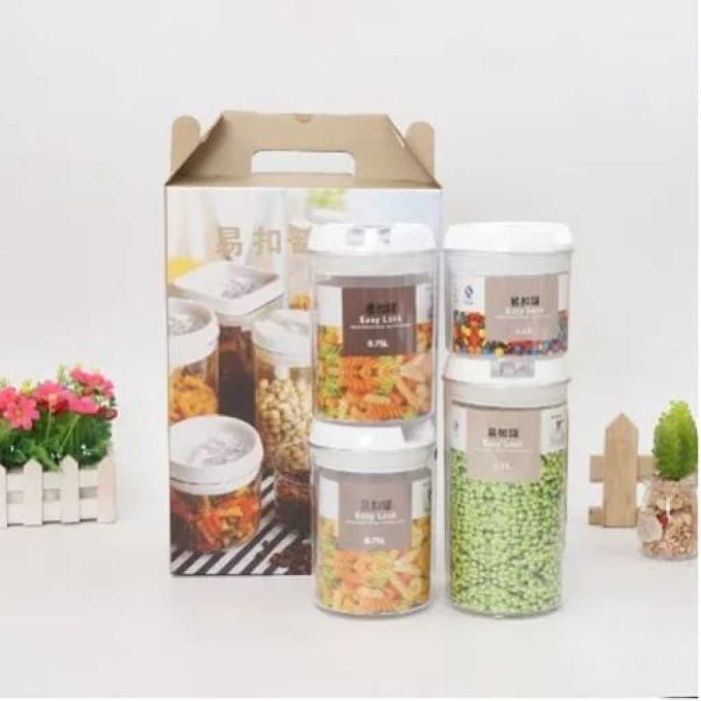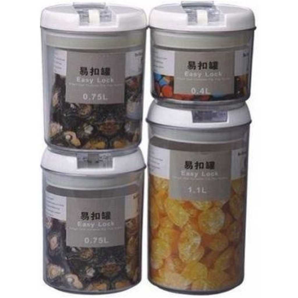 Easy Lock Round Airtight Kitchen Storage Containers 4pc Plastic Canisters With Vacuum Seal Lids- Clear Easy Lock Airtight Kitchen Storage Containers 4pc Set Plastic Canisters With Vacuum Seal Lids Discover the Best Way to Store Your Pantry Items and Ingredients Neatly Are you tired of finding bugs in your Pantry Jars and Canisters? Do your pantry or kitchen ingredients often go soggy with moisture? Is keeping your food package airtight or sealed a harrowing experience anytime you open a new spice or flavor ingredient? Would you like a better-organized pantry and kitchen with well-arranged items even with limited space? If you are like most people here now, your answer would be Yes. And you need a solution to your pantry problems… So, look no further… Let me introduce to you, the best dry food storage system now! It is the Easy Lock Airtight Plastic Food Saver. Easy Lock Food Container is the best way to preserve and store grains, flour, sugar, cheese, and milk. cereals, nuts, fruits, beverages, coffee beans, and many more pantry items. The plastic airtight rectangle-shaped food container saves you space. It’s stackable waterproof containers ensure you organize your pantry better. Easy Lock comes in an airtight sealed lid with a silicon ring designed to shut out air and moisture keeping food dry and fresh. Its flip-flop seal pot design makes it easy to open and lock even with only two fingers. Handle is easily removable guaranteeing an easy wash experience.