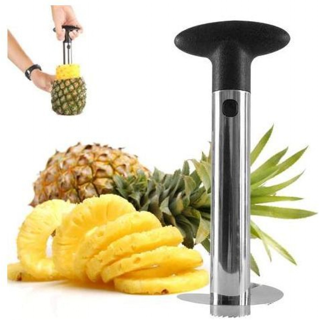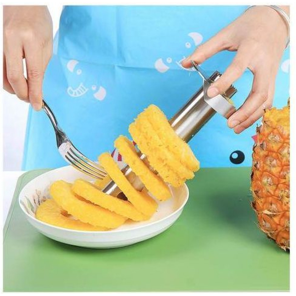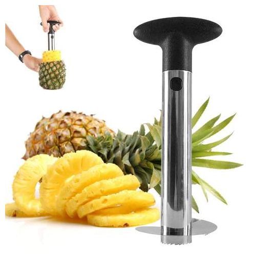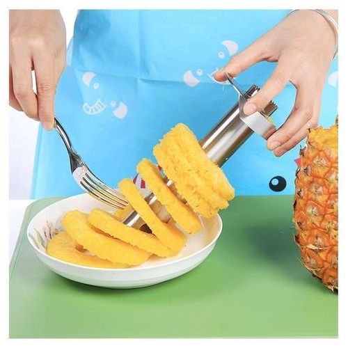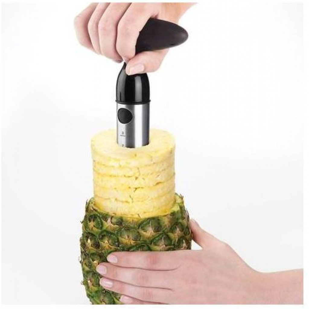 Our stainless-steel pineapple corer, cores and slices a whole pineapple quickly, safely and easily. Simply slice off and twist the slicer onto the exposed fruit to create perfect pineapple rings. Easy to clean and store, the sharp, serrated stainless-steel blade was designed to accommodate most pineapple sizes. Simply cut the crown of the pineapple off,and press corer down into flesh of the fruit, turning slowly to get it started. Pull the handle out of the shell, if it is difficult to pull out, give it a wiggle. Once you remove it, your pineapple will be perfectly cut and cored! finally press the two buttons on the turning knob to release the handle from the corer and slide your fruit rings off of and serve.