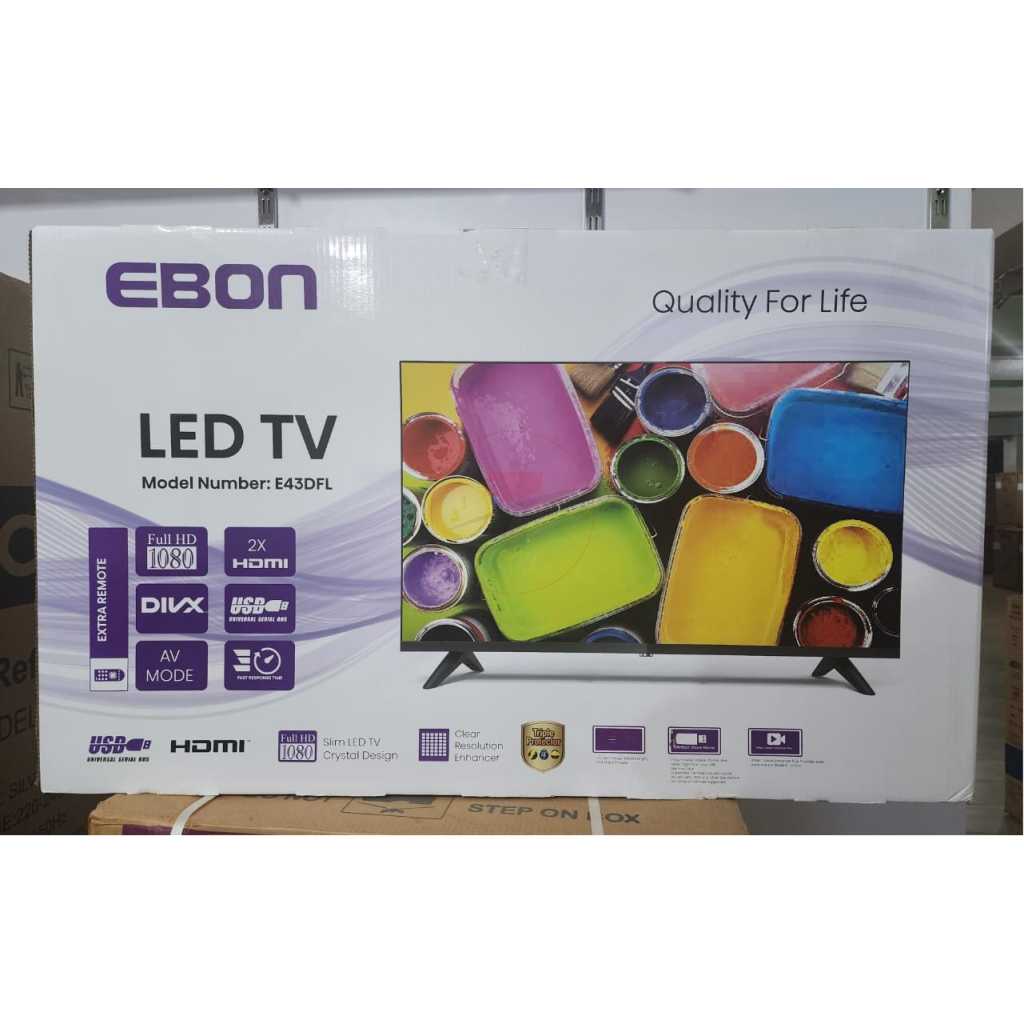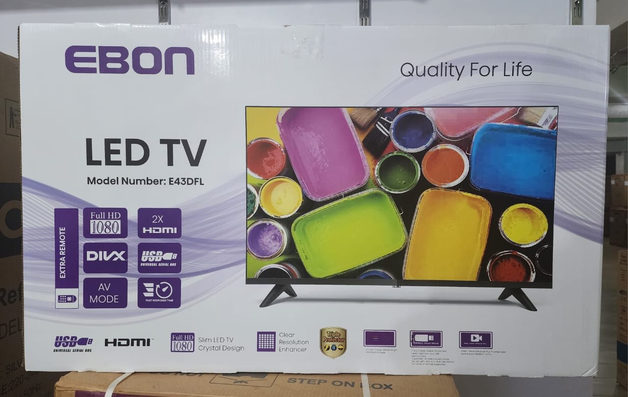 Key Features: EBON 43-Inch Digital TV E43DHD; Frameless, HD- ready LED TV, 2- Remote Controls, AC/DC, 2- HDMI Ports, USB, Inbuilt Free To Air Decoder – Black. DVB-T/T2, HDMI, USB Inbuilt free-to-air decoder 3 years warranty HD TV, 1366×768 Dolby Audio