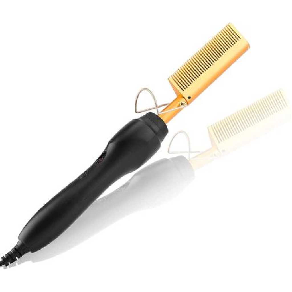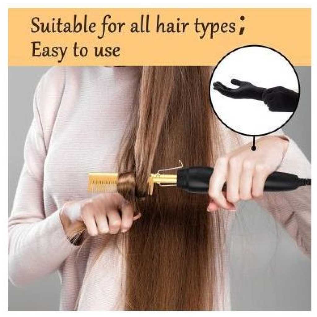 Electric Hot Comb Hair Straightener, High Heat Adjustable Temperature Iron Comb Straightening or Curly Hair – Pressing Combs for Natural Black Hair African American Hair & Wigs Electric Hot Comb Helps To Make The Hair Soft And Shiny. 1. Using ceramic technology, the electric comb can provide even heat, keep hair shiny, and do not produce frizz when straightening the hair. 2.2 in 1 Functions: not only can curly hair, but also straight hair. High-performance ALL-IN-ONE. 3. Auto-off safety feature, One-button operation design, easy to use.. 4. Suitable for all hair types: Long, short, damaged, colored, or hair extensions. 5. Lonic technology, less heat-related damage and keep hair shiny, smooth, shiny finish. Electric Hot Comb Makes your hair soft, smooth, elegant, beautiful, and shiny. Easy To Use This compact and simple straight electric hot comb comes with a 360-degree rotating power cord that prevents tangling which helps you operate with all your convenience. Usage by different temperatures follows the hair condition Gear adjustment: three gears (high, medium, low) High-end: 180~210? suitable for thick and hard hair Mid-range: 160~180? suitable for normal hair Low grade: 80~160? suitable for soft hair Titanium Alloy The heated combs provide even heat, do not harm hair, and help you make the hair bright & beautiful. Titanium Alloy The heated combs provide even heat, do not harm hair, and help you make hair bright & beautiful. Easy To Operate Simple design with On & Off switch buttons, clear to see, easy to operate. Here are 3 temperature controls, adjust the temperature. number. Heat-up Quickly The hot comb is heated quickly, and you can heat to the set temperature in just 20-30 seconds which can quickly reach the ideal temperature and greatly save modeling time.