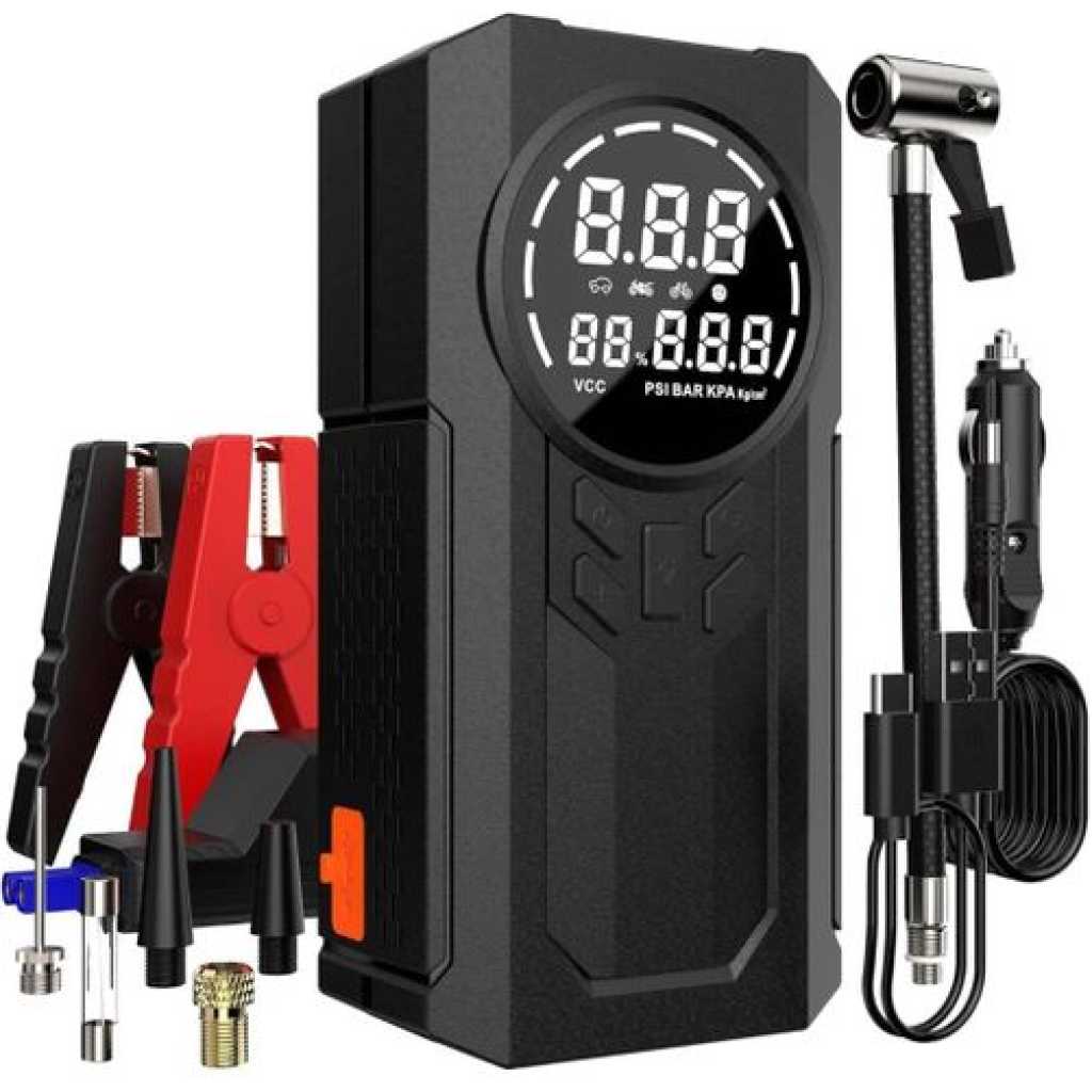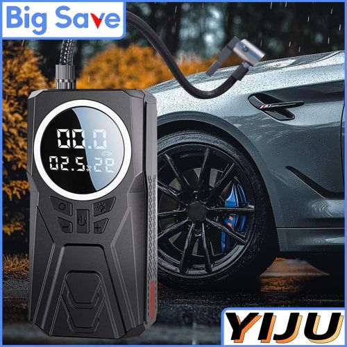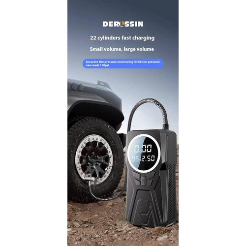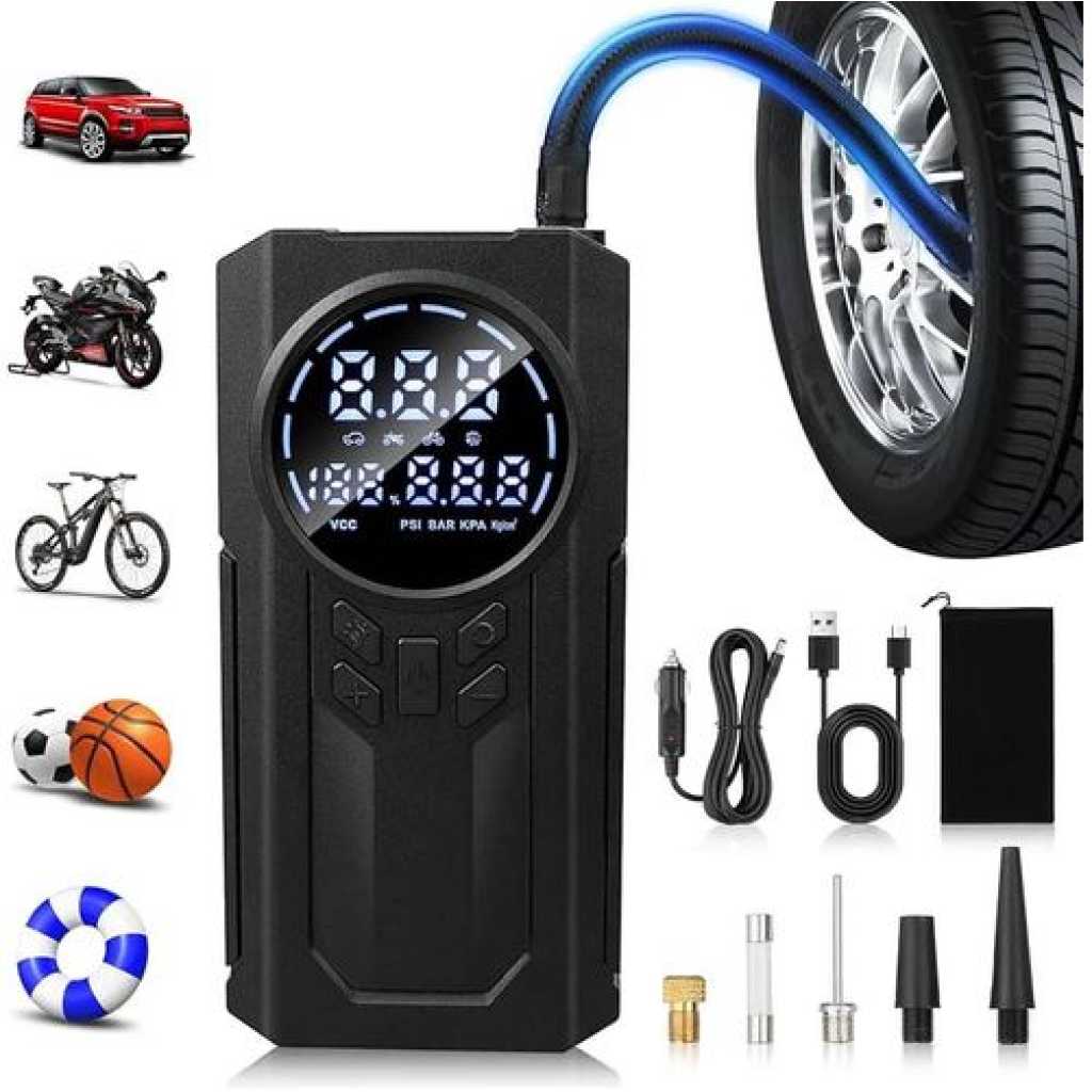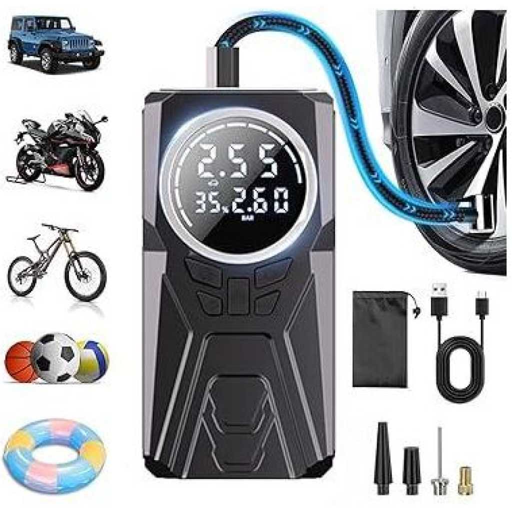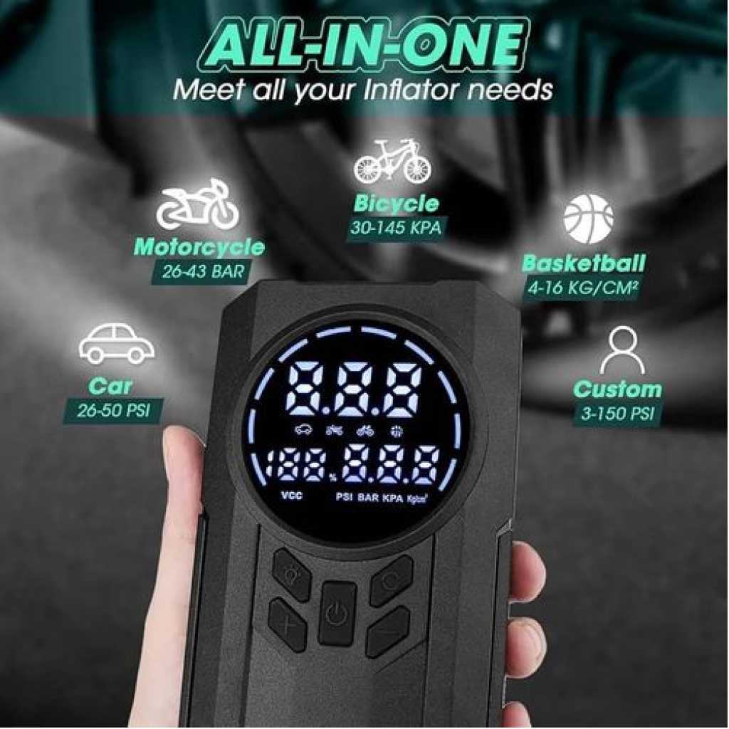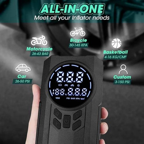 ????TIRE INFLATOR PORTABLE AIR COMPRESSOR – Equipped with a high-efficiency motor to allow for fast and efficient inflation, the 12V rechargeable battery air pump provides a maximum pressure of 150 PSI and airflow of 45L/Min, filling up the whole car tire within a few minutes. Perfect for inflating cars, motorcycles, bikes, balls, and other inflatables. ????️DUAL POWER SUPPLY – Built-in 6000mAh rechargeable larger capacity battery, letting it quickly cordless inflate up to 3~4 car tires (from flat to full) on a single charge for daily use. It comes with a 10ft DC 12V power cord directly connected to your vehicle’s power source for emergency use. it’s convenient for everyday life and travel. ????SMART INFLATION MODES – The tire pump offers 4 Preset Inflation Modes (Bicycles, Motorcycles, Cars, and Balls) and 1 Manual Mode(adjust value 3-150 PSI). And long press the mode button to select your preferred 4 Pressure Units (PSI, KPA, BAR, KG/CM²). The operation is simple, easy to use, and meets your various inflation needs. ⚽DUAL LCD DISPLAY AND SAFETY GUARANTEE – 2.36in Large LCD digital display, ensuring excellent visibility and easy-to-read, whether you’re in bright sunlight or low-light conditions. With the automatic shutoff function, the pump stops inflating once the preset pressure is reached, preventing over-inflation and ensuring safety. ✅MULTI-FUNCTIONAL EMERGENCY TOOL – Solves your urgent problems. At the top is an LED light with THREE Lighting Modes (Bright, Strobe, SOS) to help respond to roadside emergencies and nighttime use. At the bottom is a 5V/2A USB-C output port to make it an emergency power supply for your phone or other electronic devices. ✅QUIET AND EFFICIENT OPERATION – Adopts upgraded acoustic noise reduction technology, with a noise reduction structure frequency as low as 80 dB. And the heat dissipation holes on both sides of the left/right side and the back, greatly increase the heat dissipation area, ensuring effective and reliable heat dissipation. ✅WHAT YOU GET – 1* Portable Inflator Pump, 1* Air Hose with Schrader attached, 4* Air Nozzles, 1* Fuse, 1* Type-C Charging Cable, 1* DC Power Cord, 1* User Manual, 1* Storage Bag. Lightweight and compact design, making it easy to carry and store in your car or backpack. it’s also a great present for Dad/Husband/Brother/Boyfriend/Family or Friends.