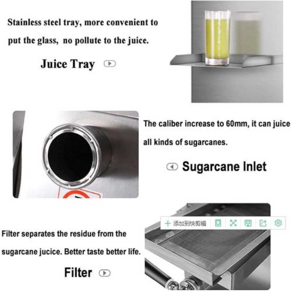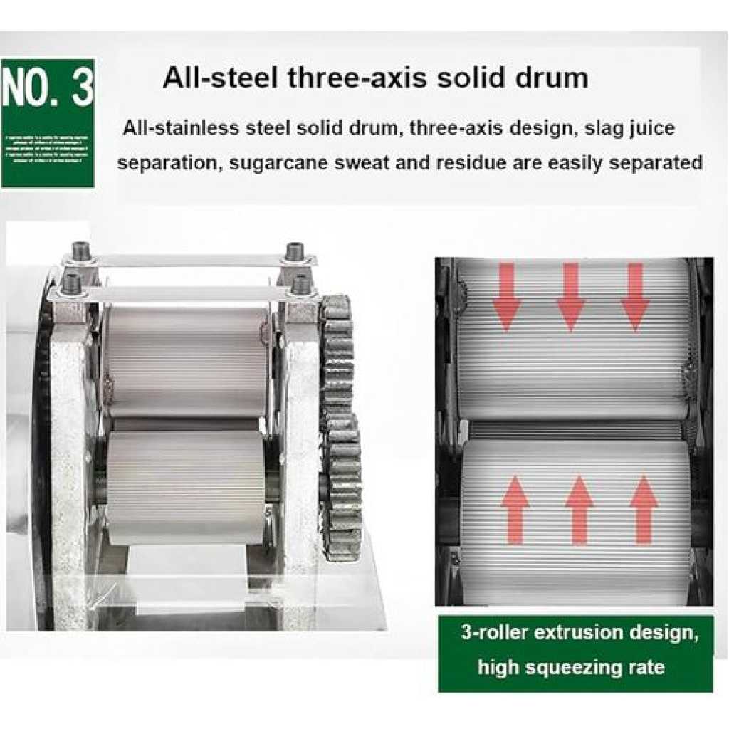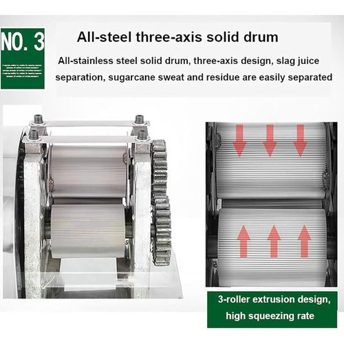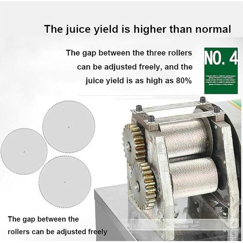 Key Features: [EFFICIENT JUICING]: The sugarcane juicer is powered by a 24V battery, equipped with a 350W pure copper motor, 20 rpm slow juicing, high slow juicing rate, and will not destroy the nutrients of the juice. The high productivity of 200kg/hour can maximize the juice yield and efficiency [THREE-AXIS SOLID ROLLER]: Adopting all-stainless steel solid rollers and three-axis design, it is easy to separate sugarcane bagasse and sugarcane water. The gap between the three rollers can be adjusted freely, and the juicing rate is as high as 80%, which is higher than that of ordinary juicers [6CM FEEDING PORT]: 6cm large-diameter feeding port, reasonable feeding port size and depth design, can facilitate the entry of sugarcane, and effectively prevent the hand from accidentally reaching in and causing danger. The roller tension gap can be adjusted to increase the juice yield by 30% [MATERIAL]: The sugarcane juicer is made of food-grade stainless steel, which is anti-corrosion and wear-resistant, dur-able and easy to clean and maintain. The independent juicing bin and removable dense filter box are convenient for daily cleaning [WIDE APPLICATION]: Our compact sugarcane juicer saves space and is suitable for a variety of environments – beverage shops, outdoor stalls, fruit shops, hotel kitchens, etc. Enjoy delicious sugarcane juice anytime, anywhere