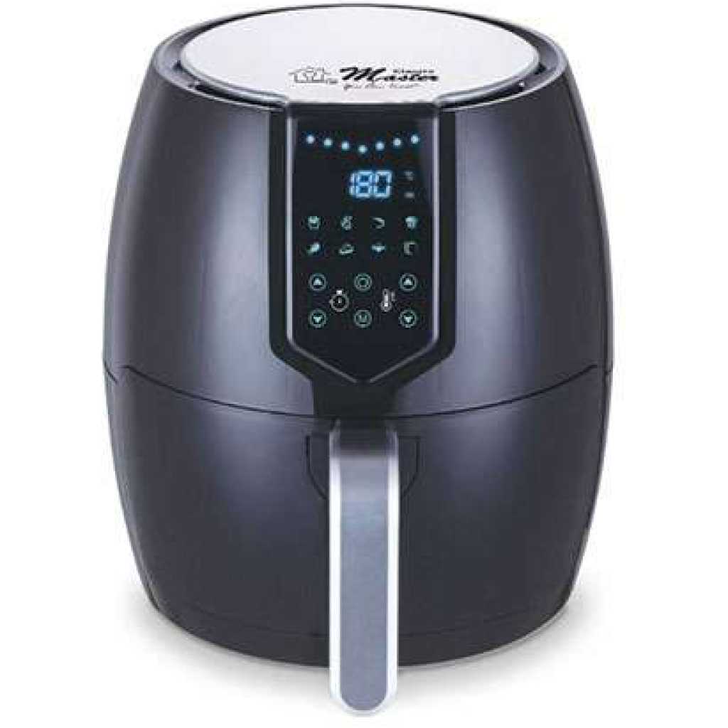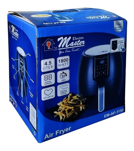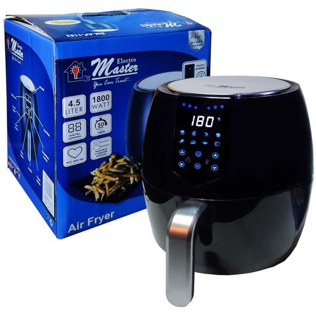 Key Features: Electro Master Digital Air Fryer EM-AF1153, 4.5L, 1800W Microcomputer Control Preset timer Over Heat Protection. LARGE CAPACITY -It has 4.5 L liters of cooking capacity, so you can easily cook enough healthy low-fat food to feed a small family using little to no oil. TOUCHSCREEN LED DISPLAY, DOUBLE PROTECTION – The fryer has a touchscreen LED display that lets you set the timer and temperature and also tells the progress of the food being fried. It has double protection layers for ensuring safety. You can cook various food items in it including fries, chicken, sausages, gammon, and more. NON-STICK BASKET WITH LFGB & FDA – This air fryer has a large capacity basket of 3.5L. You can cook meals for the whole family at a time. The basket is made entirely from non-stick material and is gentle on the food. It does not get greasy, so you can get your fried food out with ease. It is LFGB, FDA-passed, and safe for your health. OVERHEATING SAFE – No matter if you are busy doing some other work, this air fryer has an overheating protection feature that will turn off the air fryer after reaching the desired temperature as per your dish.