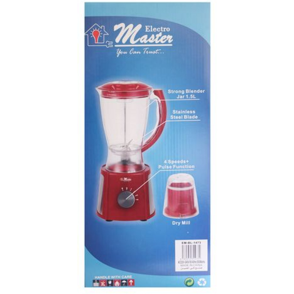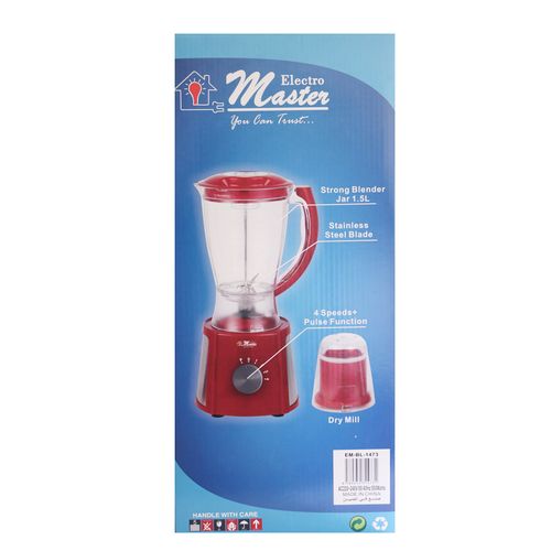 With this Electro Master 1.5L Blender, you can whip up delicious fresh fruit juices, smooth sauces, and homemade soups in an instant! It’s the perfect appliance for all your family favorites! Its sharp stainless-steel blades guarantee it will last you for a very long time, while its practical dosing cup makes it oh-so-easy to use! Simply open the lid and dosing cup to safely and easily add ingredients while the blender is operating.The mini-grinder opens up a whole new world of possibilities, allowing you to grind and grate your spices and ingredients in the blink of an eye. Blending has never been so easy!