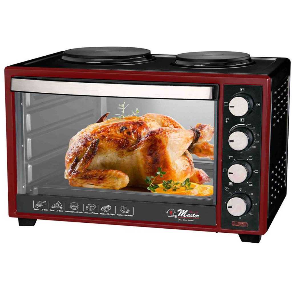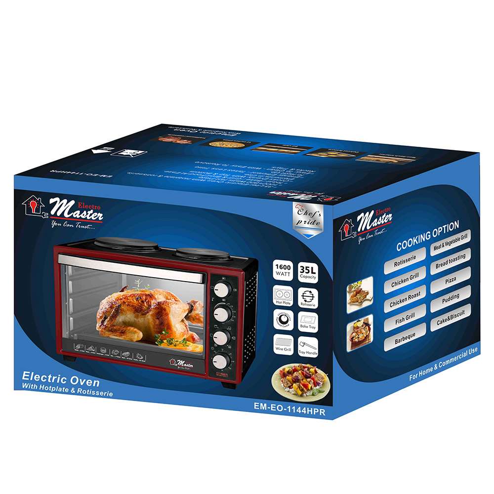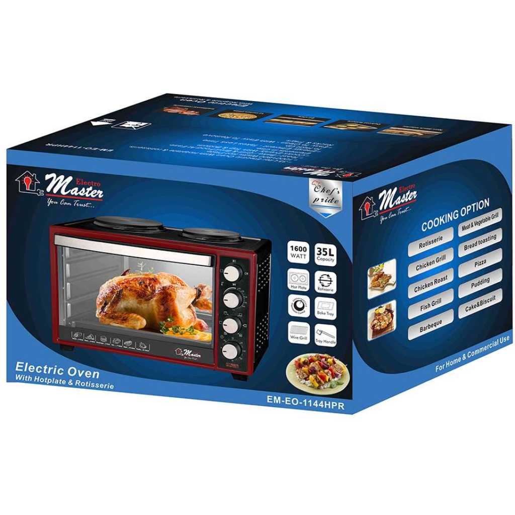 Key Features: Electro Master EM-EO-1144-35HPR 35L Oven With Hot Plate – Black/Maroon. 1600 Watts 35 Litre Capacity Bell Ring Wire Grill Thermostat Control Bake Tray Hot Plate Tray Handles