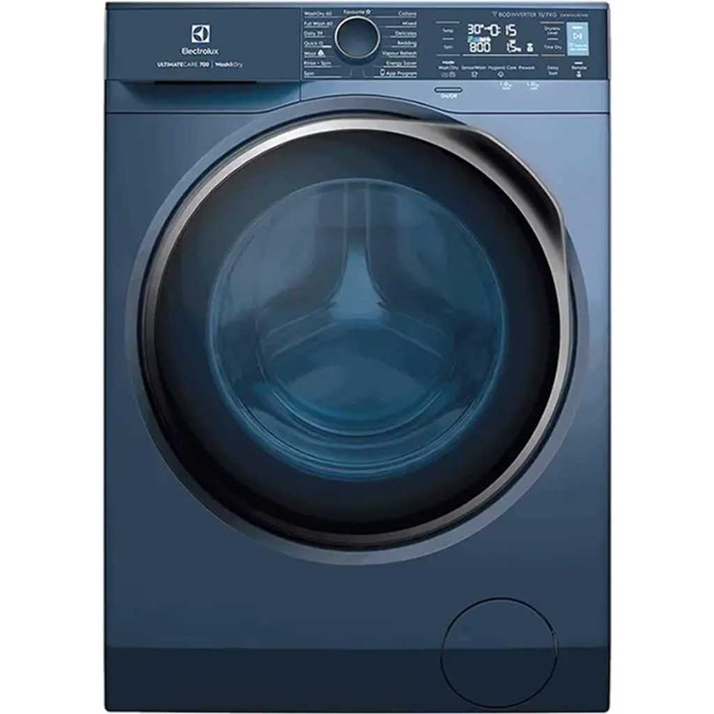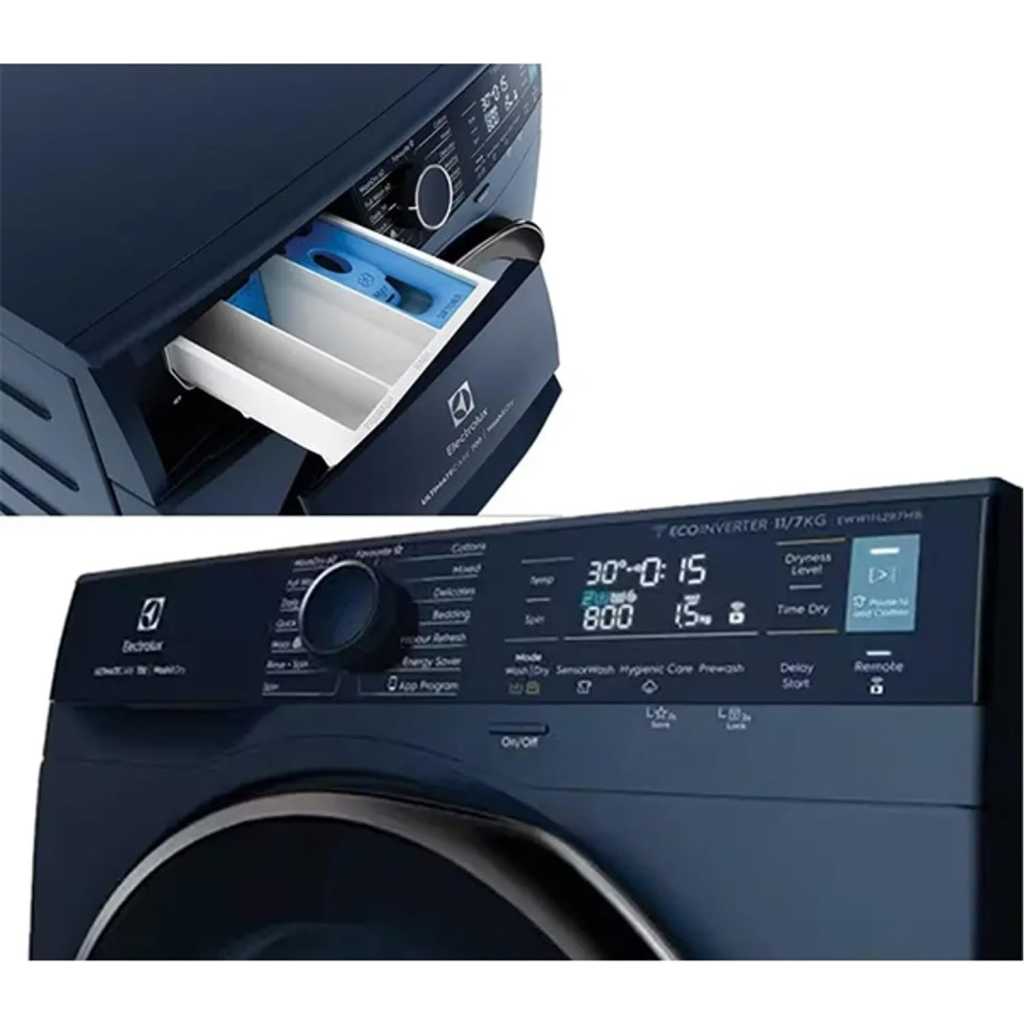 Electrolux 10/7 KG Washer Dryer EWW1042R7MB, 1400 RPM, EcoInverter Motor, Fully Automatic Front Load Combo Washing & Drying Machine, 15 Programs – UltraMix/Delay Timer/SensiCare/Child Lock – Blue. 【SENSOR WASH】 Wash out all kinds of stubborn stains with ease, without the need for pre-treatments. SensorWash technology use AI sensors to automatically detect dirt and soil levels and then adjusts the cycle duration accordingly to effortlessly remove 49 different visible stains, including oil, red wine, mud and chocolate 【ULTRA MIX】 With UltraMix technology, detergent and softener is thoroughly dissolved and activated before it enters the drum. This ensures that your clothes are cleaned without leaving visible detergent residue at the end of the cycle. With UltraMix you can say goodbye to visible detergent residue and forget rewashing 【ABAYA CARE】 Abaya care with confidence. The dedicated Abaya cycle uses a very low spin speed and 3 rinse phases to deliver specific care for delicate Abaya fabric. Outstanding cleaning performance combined with tailored care means you can wash your Abaya with confidence 【HYGIENIC CARE】 Clean with added hygiene. The HygienicCare option finishes the wash cycle with a soft spray of vapour to remove up to 99.9% of allergens and germs.* HygienicCare produces vapour at just 40°C, so it is gentler on your fabrics, whilst also saving energy 【VAPOUR REFRESH CYCLE】 Refresh without washing. Quickly revitalise your garments and smoothen out creases in under 30 minutes with the VapourRefresh cycle. Your clothes will emerge refreshed, with up to 23% less wrinkles compared to air drying From the manufacturer